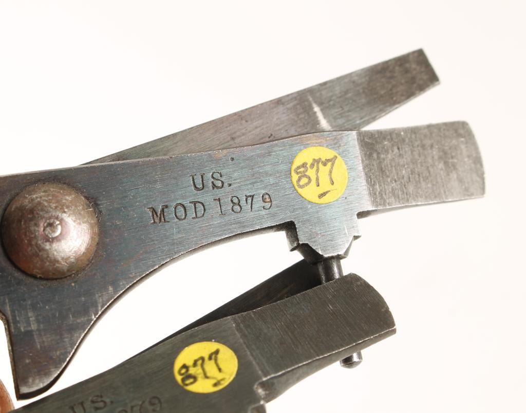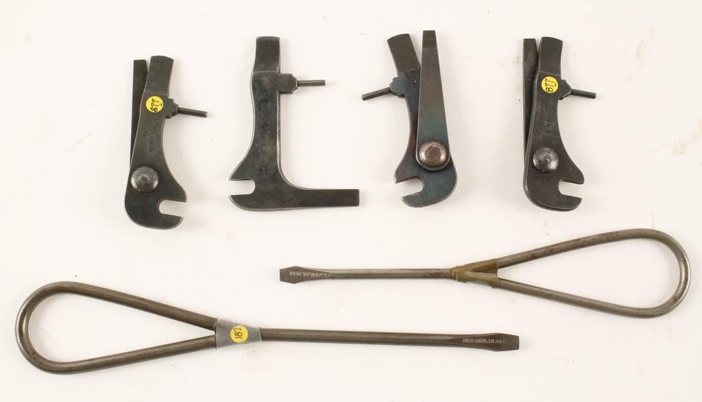 Lot of Military Combination Tools and Screwdrivers includes three U.S. Model 1879 combination tools and a rare unmarked 1871 combination tool for Sharps, Remington and Springfield rifles. Also two iron screwdrivers with open loop handles with one approximately 7.5" overall and marked on blade "PAT. JAN. 18. 188_," the other approximately 6" overall and marked on the blade "PAT. JAN. 18. 1881." Condition: All tools in good to very good condition.EST.: $100-$200