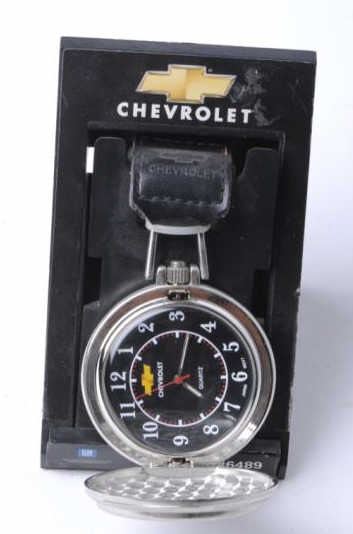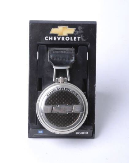 Chevrolet pocket watch with leather strap and display stand; good condition; not running; appears to need battery. Est.: $50-$100.