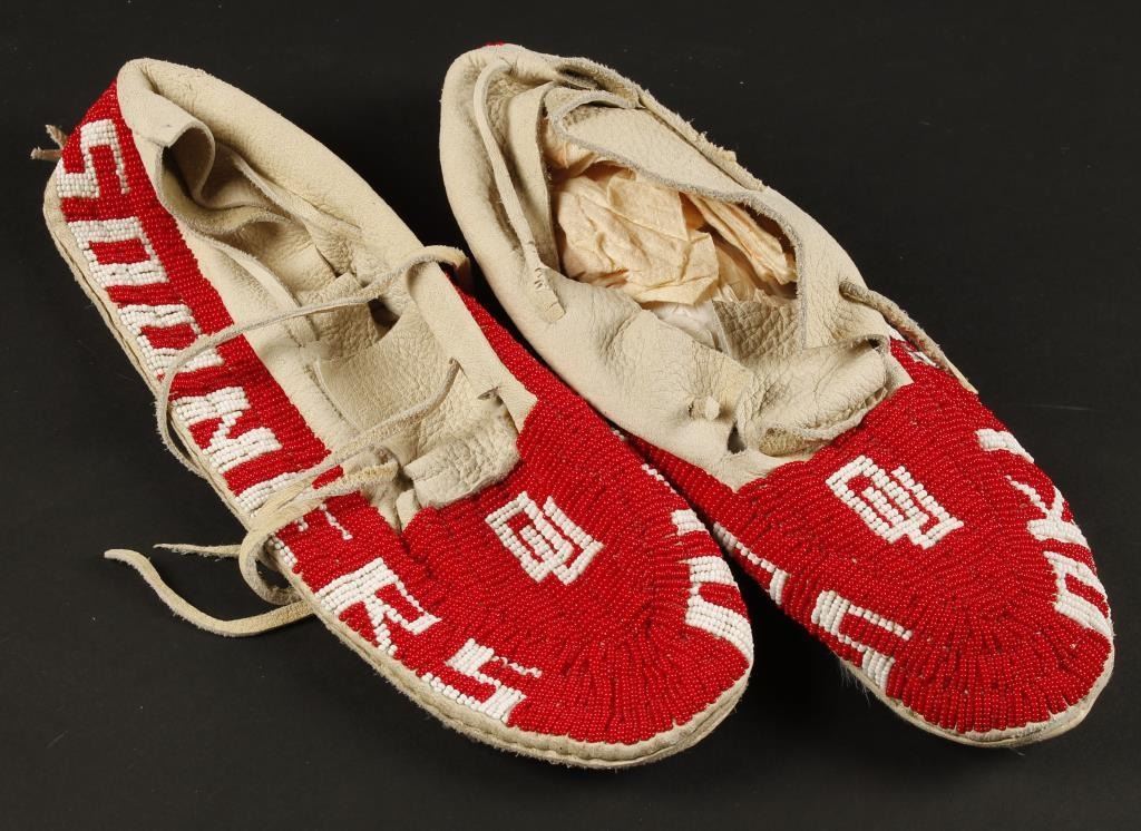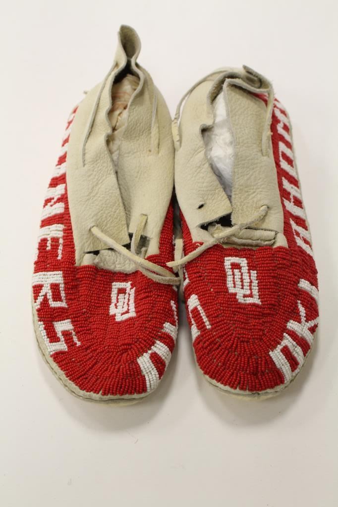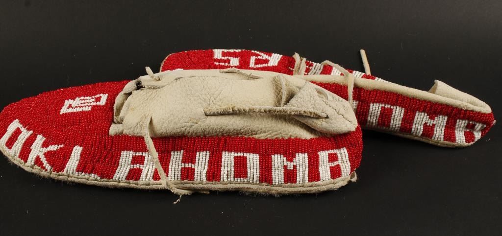 Lot 1640 Beaded Moccasins with University of Oklahoma motifs, last 50 years. Est:$150-300