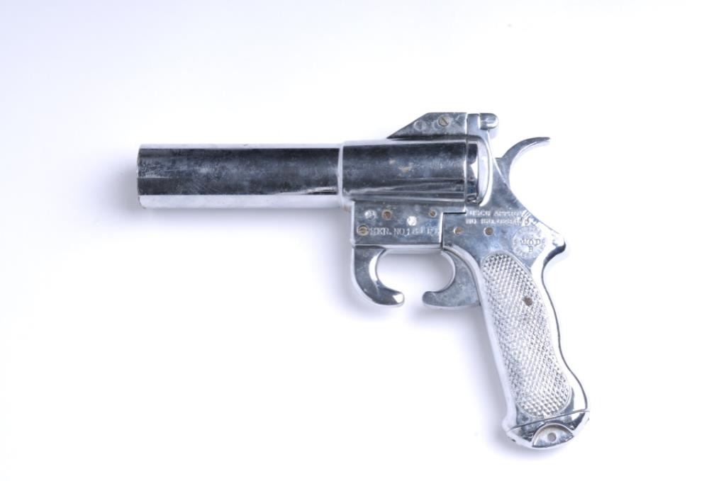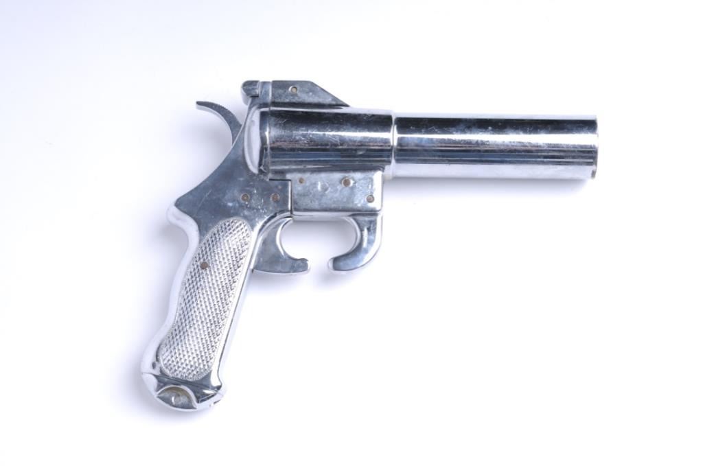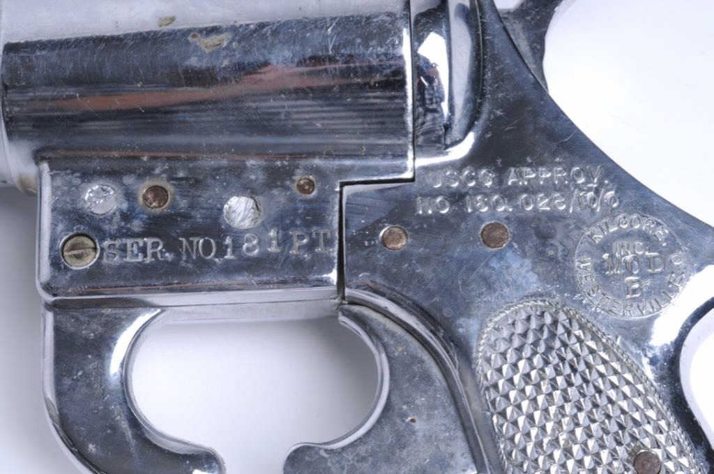 Lot 1647 Kilgore flare pistol marked Ser. No. 181 P.T., nickel plated, 37MM. In very good condition. Est.;