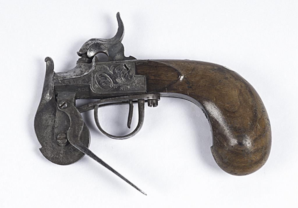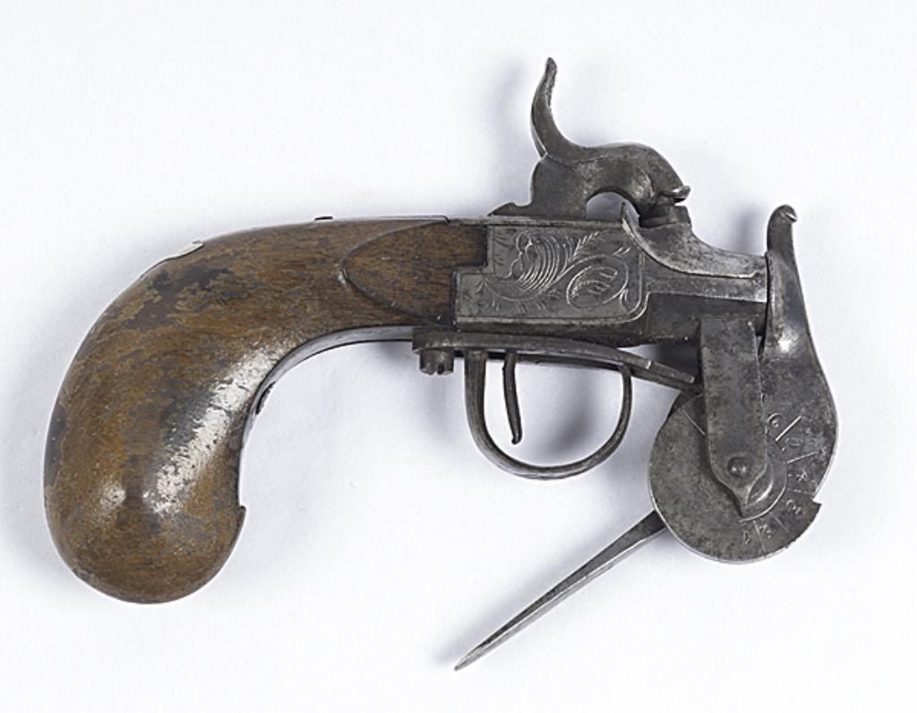 A percussion black powder tester. Indexing wheel with eight different strengths engraved. The frame is stamped 804 and engraved. One piece walnut grip with German silver shield thumbprint. All metal parts have a flat gunmetal patina. The griphas some slight nicks and dings. Mechanically operable. Est:$300-500