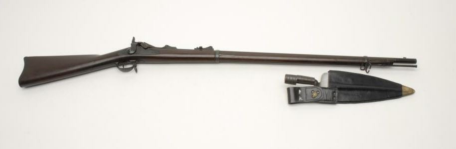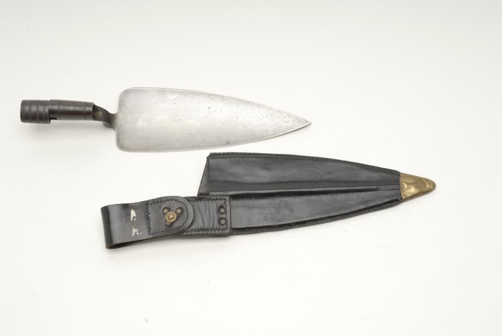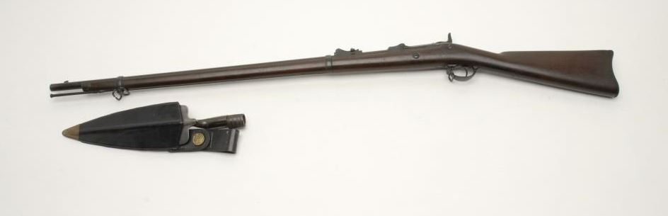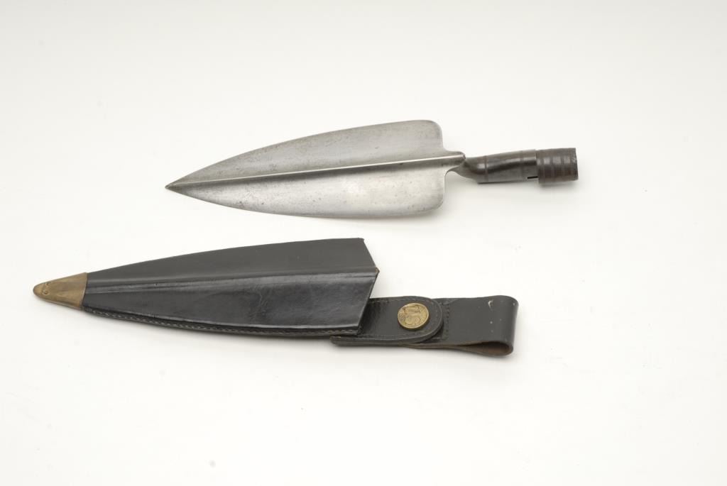 U.S. Springfield trapdoor rifle, .45-70 caliber, 32.5” barrel, S/N 195250, in overall very good + condition showing considerable military finish to metal surfaces mixed with a plum patina; crisp action, very good markings, fine bore and verygood wood stock showing normal wear; no visible proofs or inspector’s cartouches; accompanied by a desirable trowel bayonet with leather sheath and hanger. (Antique). Est.: $700-$1,400.
