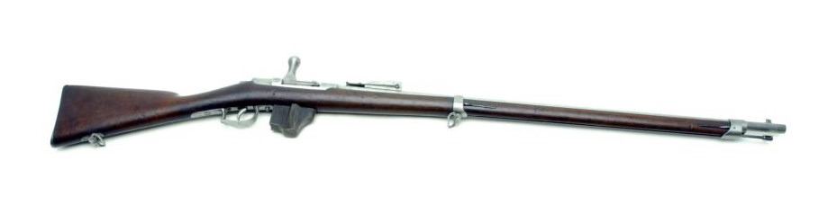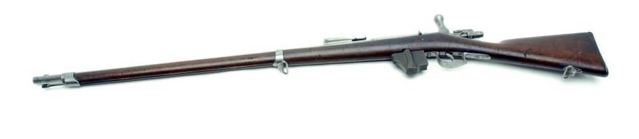 Dutch Beaumont bolt action rifle, 11mm caliber, 33” barrel, S/N 1223, in overall good to very good condition, 1876 dated, light grey patina, very good bore, crisp action, good markings and very good stock with partially visible inspectorcartouches. (Antique). Est.: $150-$300.