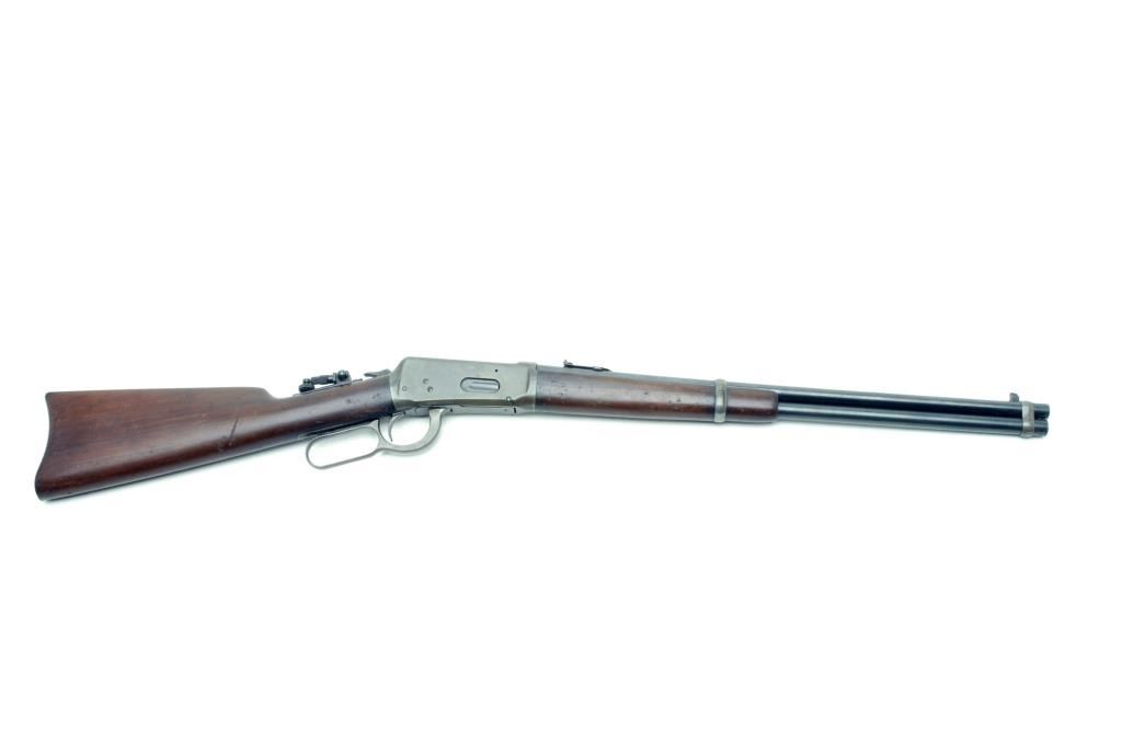 1894 Winchester Saddle Ring carbine, 30 W.C.F. cal., serial #550376. The carbine is in very good condition with a 20” blued barrel with standard post front and three leaf folding rear sight. A period Lyman tang sight has been added. The barrel and magazine retain approximately 80% of their blued finish. The receiver has gone to grey patina with some flaking blue still evident in protected areas. The smooth gumwood stocks are in overall very good condition with light surfacemars and compressions, the butt stock ends with a smooth metal crescent butt plate. The bore is good, the action crisp and markings sharp. Est.: $600-$1,200. (C+R)