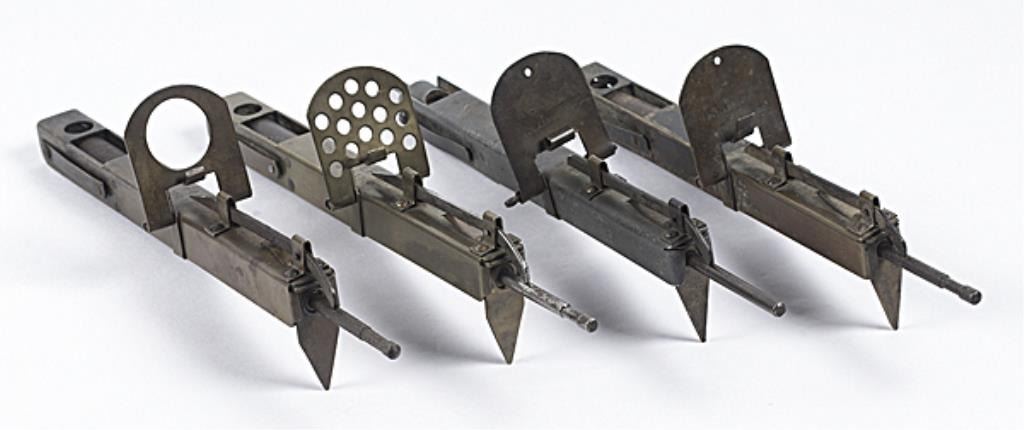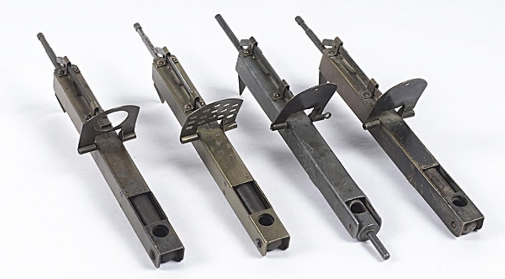 Four "NEVER-FAIL" Alarm Devices 8.5" long, three of brass and one of iron with pivoting blank cartridge holder and spring loaded firing pin. Two marked "THE NEVER-FAIL / PAT. OCT. 17, '22." Good condition Overall age toning. Est:$200-400