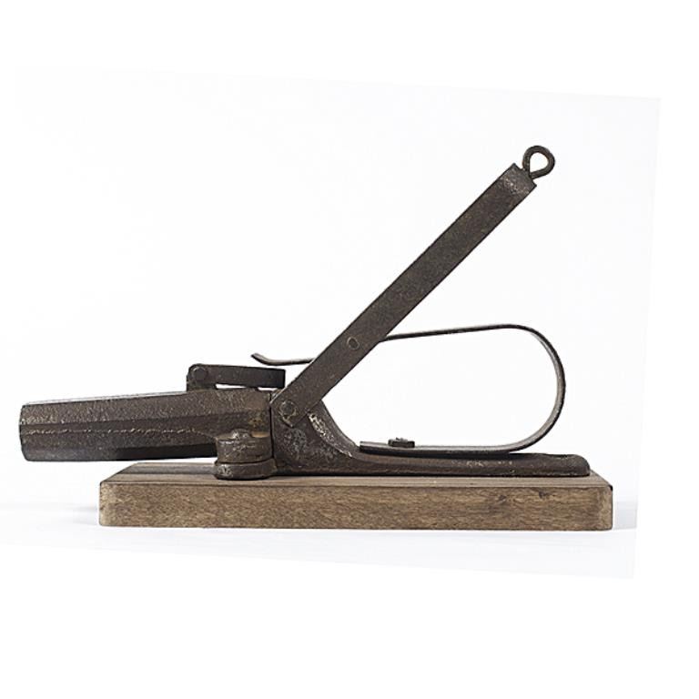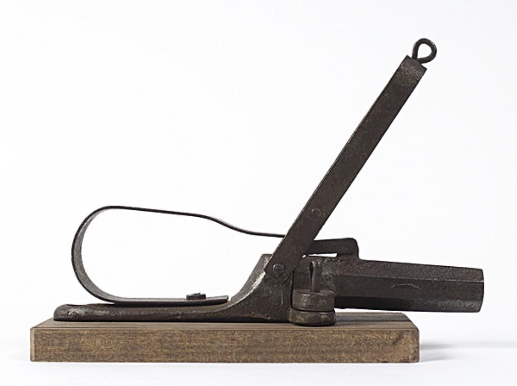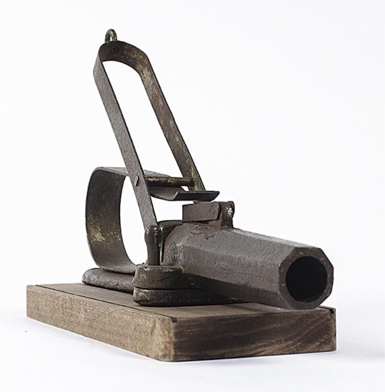 Belgium Pinfire Shotgun Trap Gun approx 12Ga., 4.5" barrel, Belgium proof marks on top flat of barrel, Mounted on wooden base. Very good condition, bore is dark an pitted, overall pitted appearance. Est:$300-500