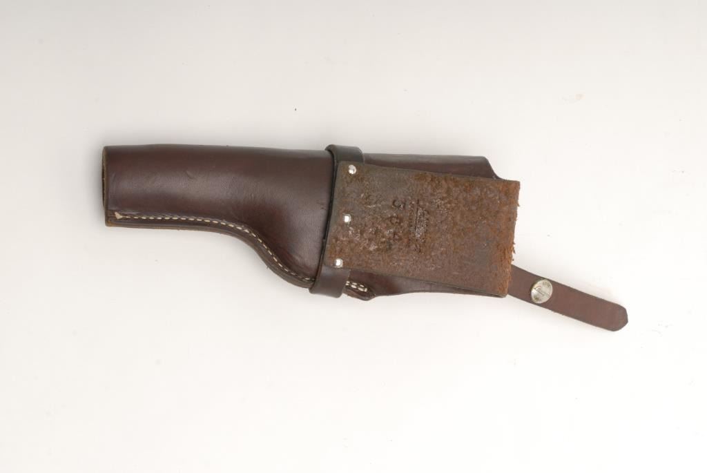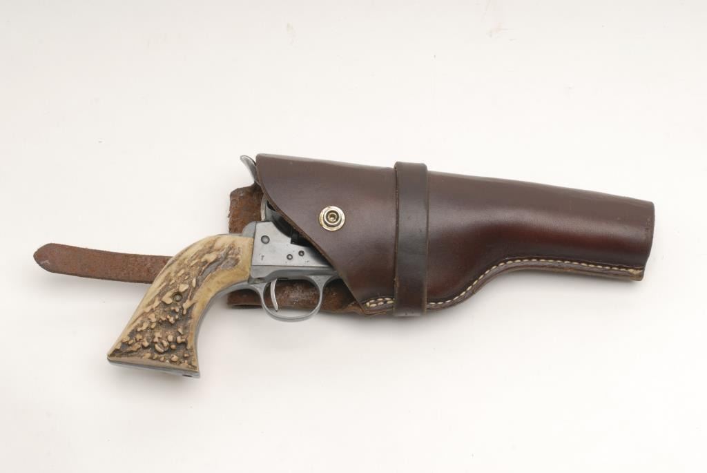 West German-made Single Action Army revolver for Hy Hunter Firearms, .44 caliber, 5.5” barrel, S/N 5/0622, blued finish, thick stag grips, in overall fair to good condition showing considerable blue with muzzle wear from holstering; good bore andmarkings, action is not working, good grips. Accompanied by a leather holster by Lawrence. (Modern/PPT). Est.: $75-$150.