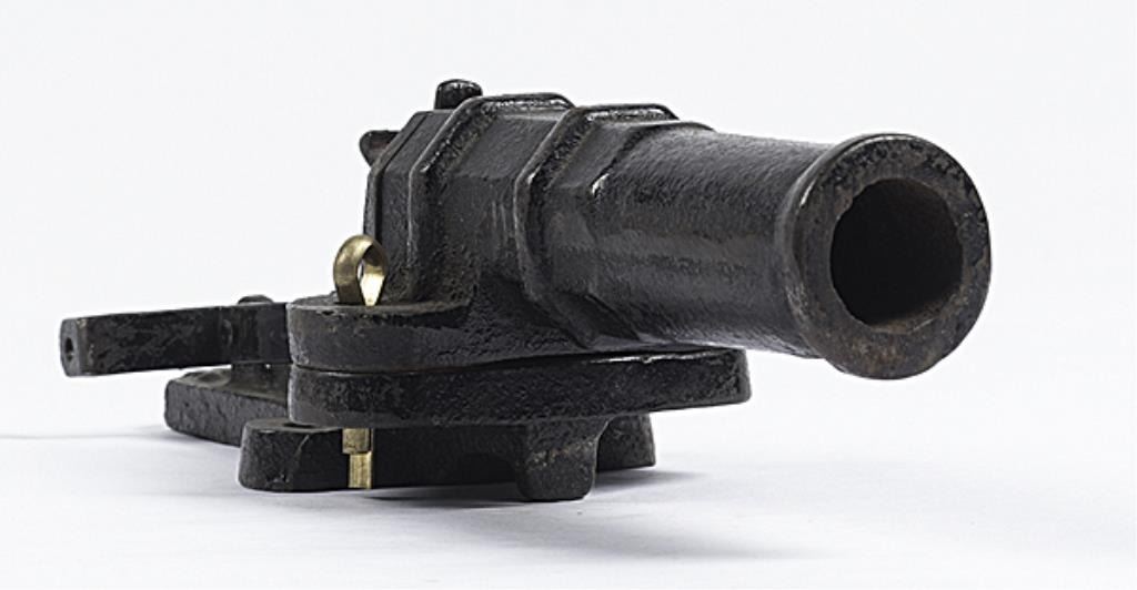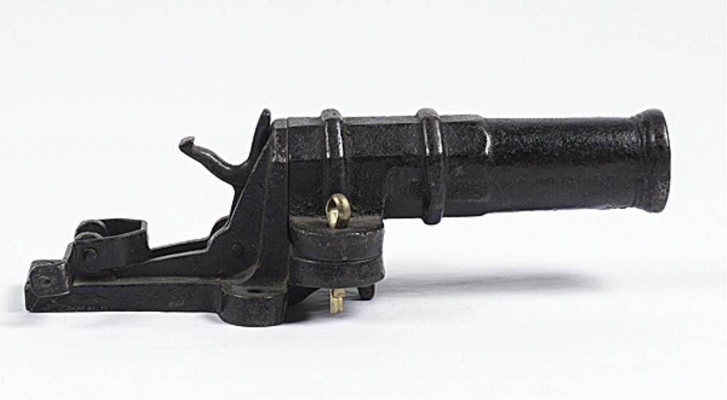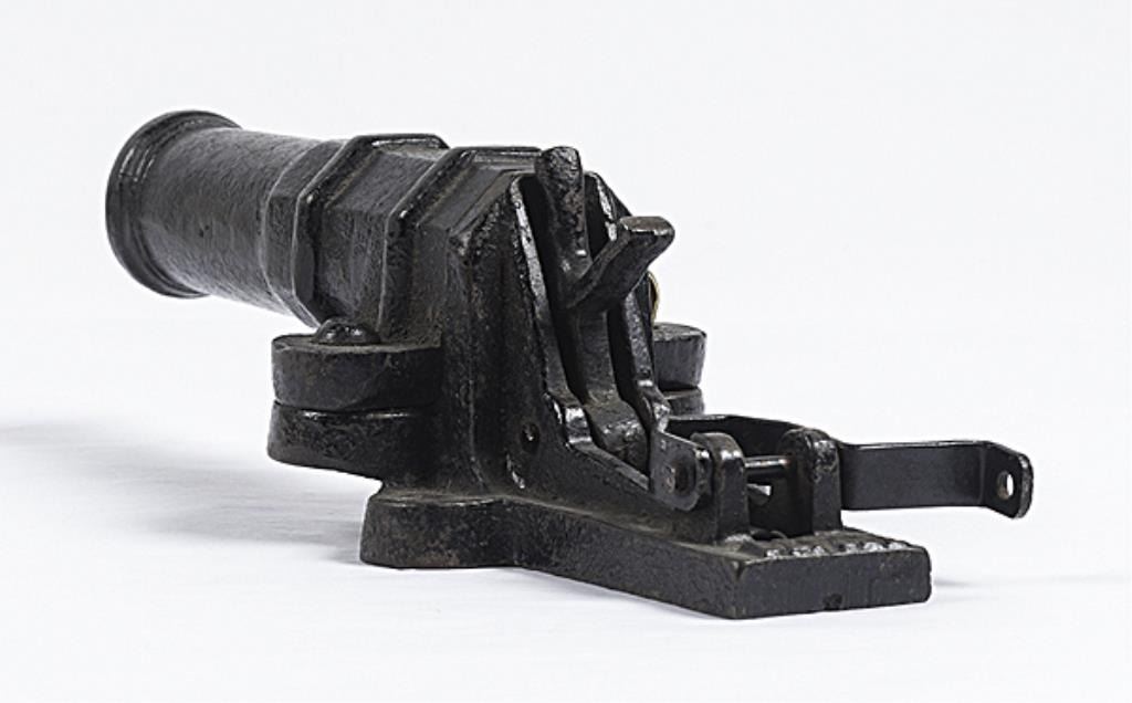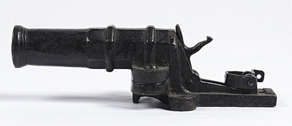 French Made Trap Gun .825 bore diameter, 5" cannon barrel, cast iron stand marked "DEPOSE", for center fire cartridge.Good condition. Retains much of the black painted finish. Est :$300-400