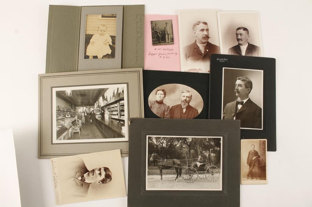 Small lot of cabinet photos of individual subjects as well as the interior of a General Mercantile store and a gentleman in a horse-drawn carriage; also a tintype of two dapper businessmen. From the estate of the late Joe Kiser. Est.:$75-$150.