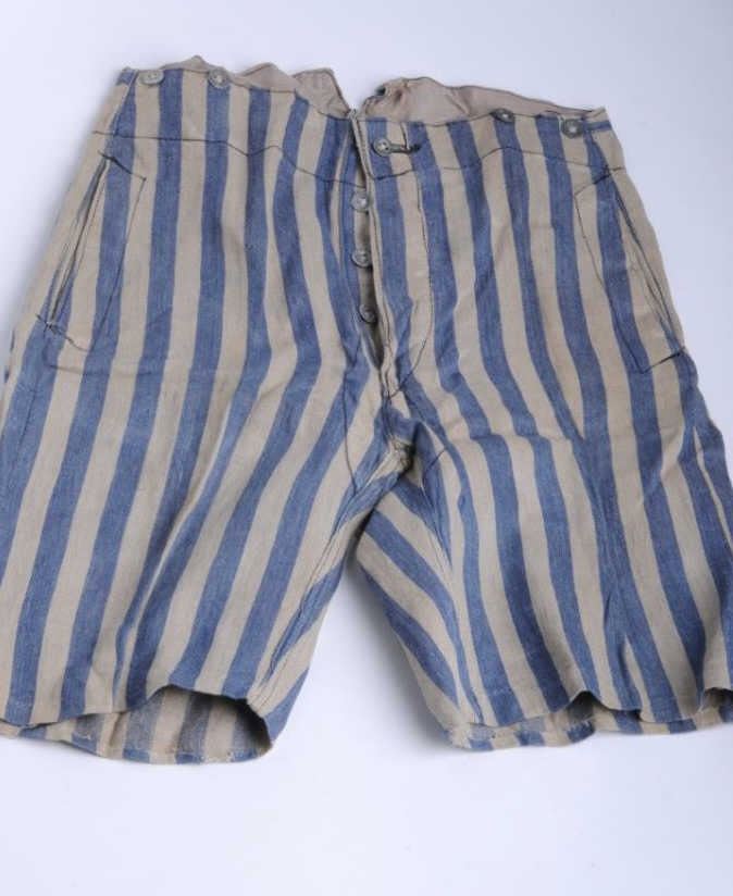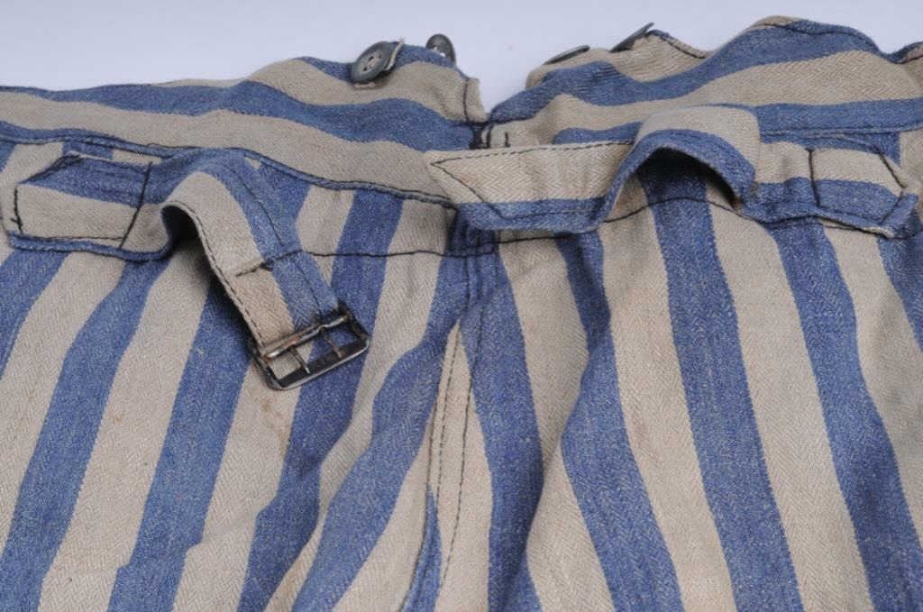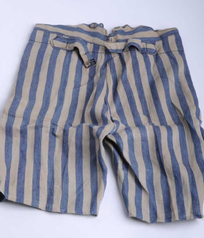 Rare German Concentration camp striped blue and white cut off trousers; soiled but in overall good condition. Est.: $300-$600.