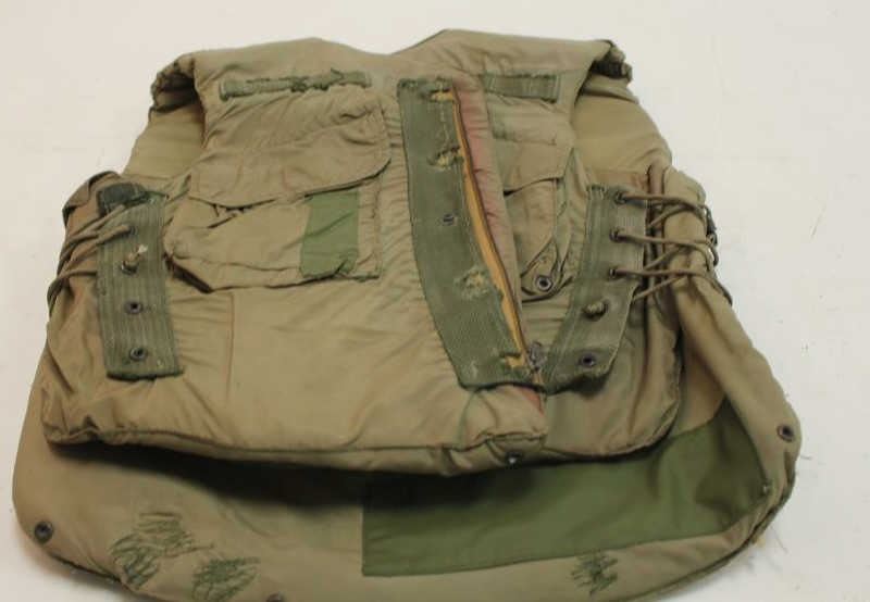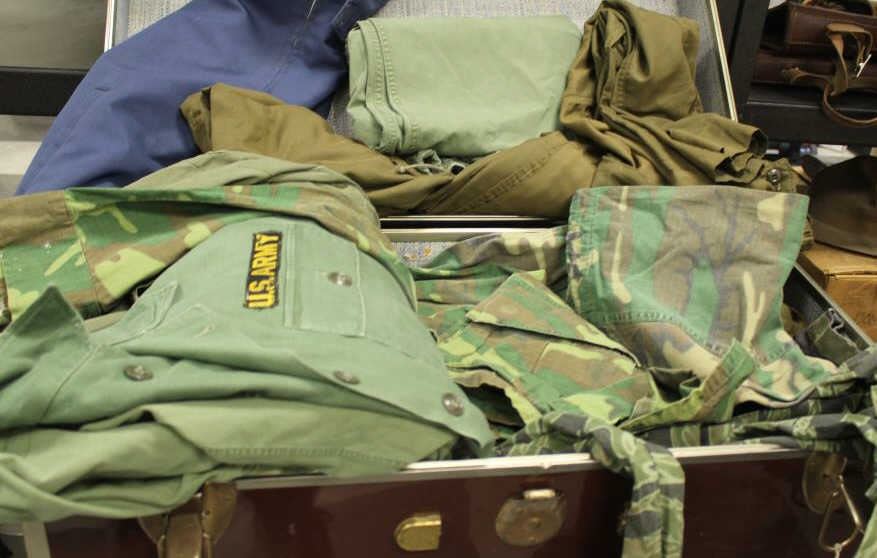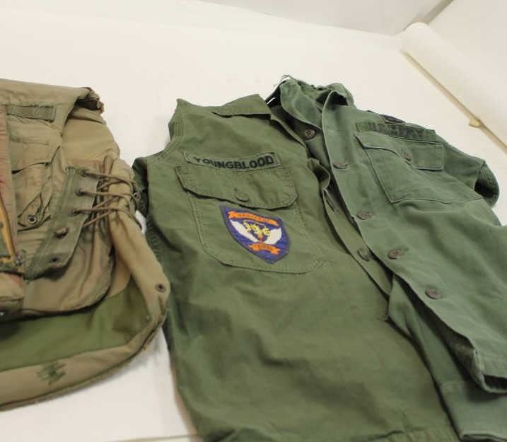 Trunk with bonanza lot of Vietnam period uniforms including OD jungle fatigue blouses, 1 pair of jungle pants, 1 flak jacket and camo jackets. Uniforms in good condition, flak jacket is poor. Est.: $200-$400.