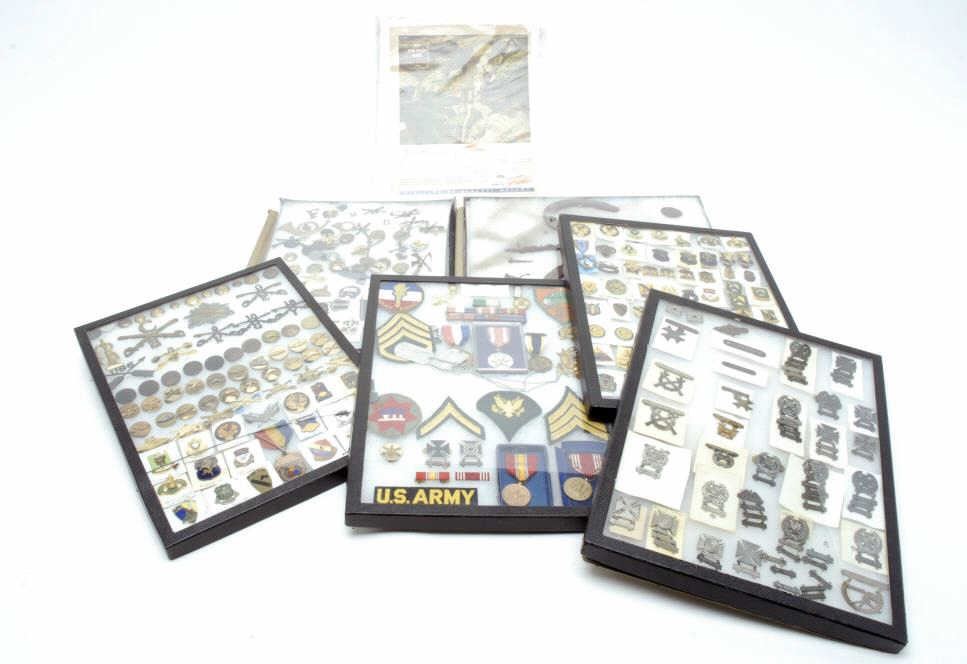 Lot of 8 riker case of U.S. military insignia, medals, shooting badges; also relics ID’ed as found at Camp Furlong, Columbus, N.M. Est.: $250-$500.