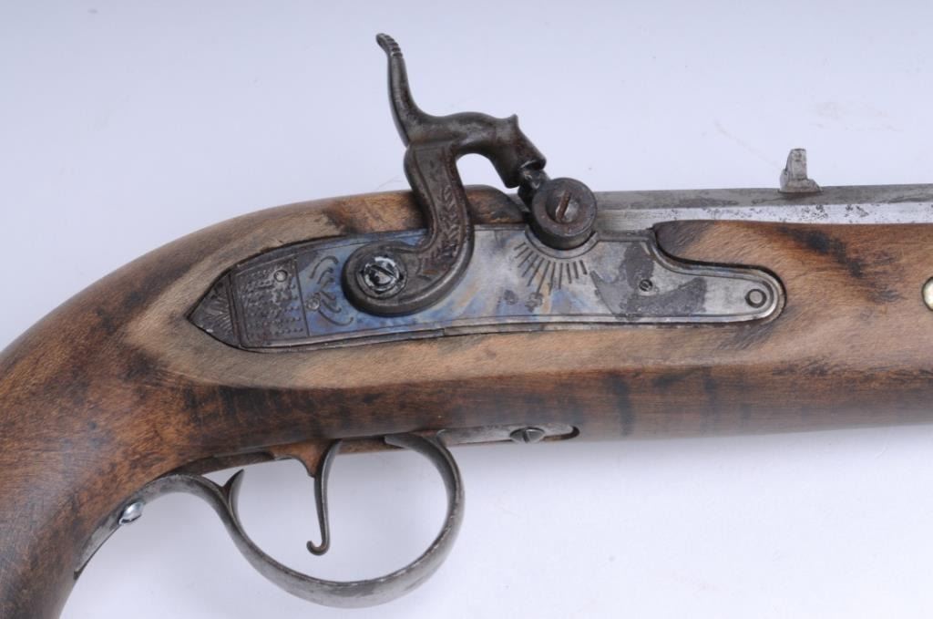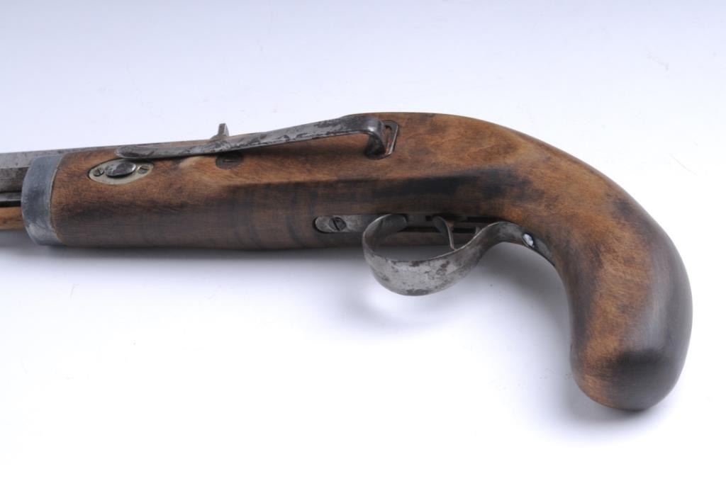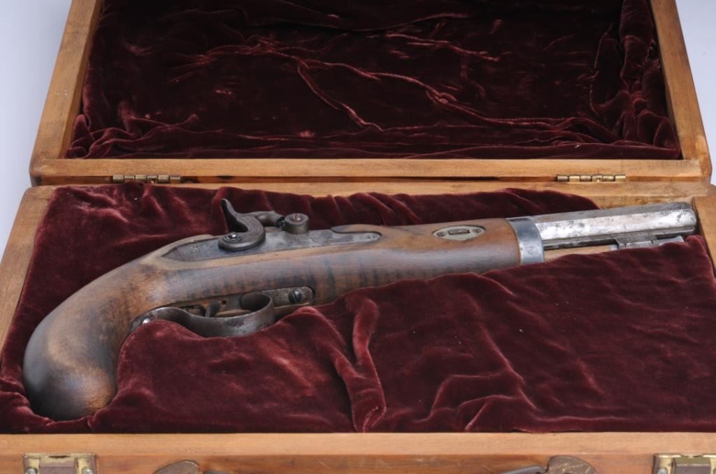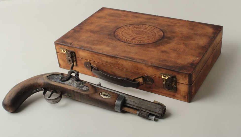 Lot 1735 Conn. Valley Arms .50 caliber Hawken pistol. Artificially aged and cased in fancy velvet lined box