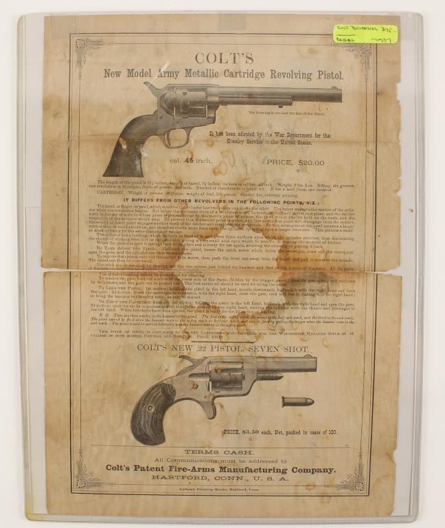 Lot 1750 Original Colt broadside paper advertisement for the Colt SAA revolver and New Line .22 seven shot