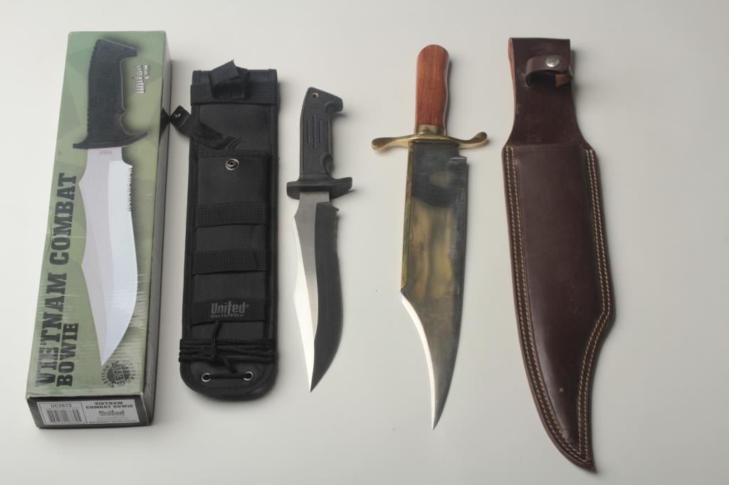 Lot of 2 large modern knives including a huge bowie knife approximately 19” overall and in good condition with a leather scabbard; also a Vietnam Combat Bowie with woven scabbard, approximately 15” overall and in like new condition “in thebox”. Est.: $50-$100.