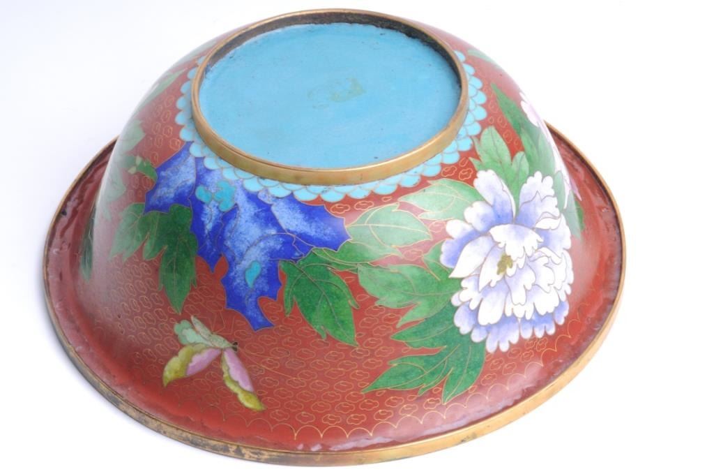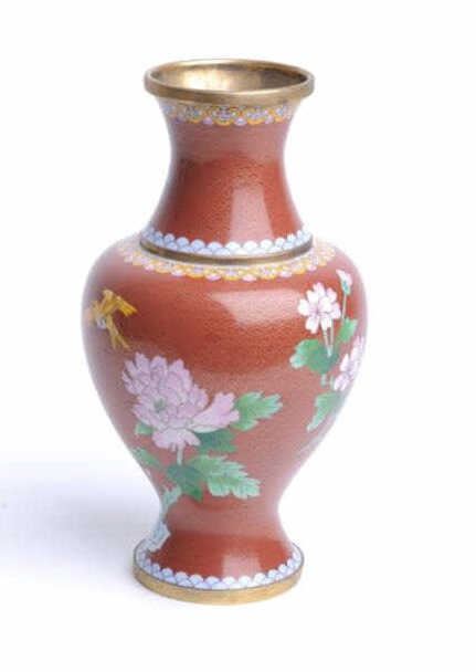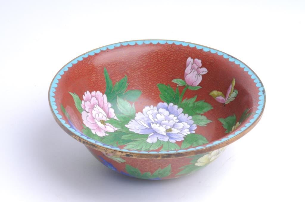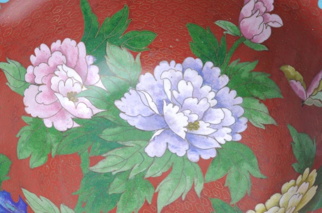 Cloisonné set of three pieces including two vases, each approximately 12” in height with floral design and yellow bird against a red background; also a bowl, approximately 10” in diameter and 4” in height. Est.: $100-$200.