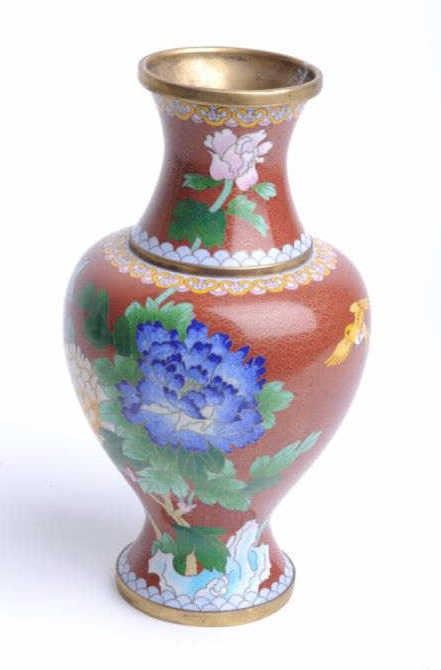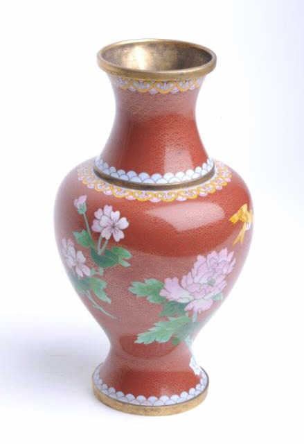 Lot 1798 Cloisonné set of three pieces including two vases, each approximately 12” in height with floral de