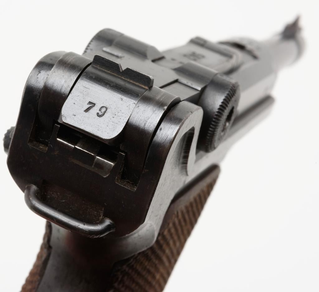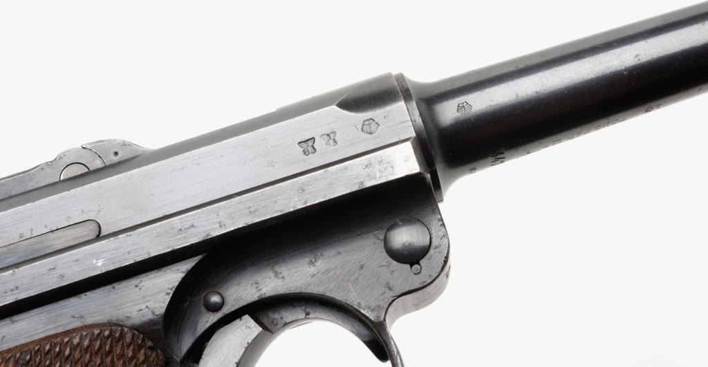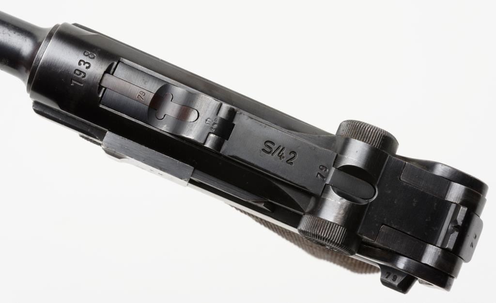 Lot 1805 **German Luger semi-automatic pistol, 9mm caliber, 4” barrel, 1938 and S/42 marked breech, eagle 55