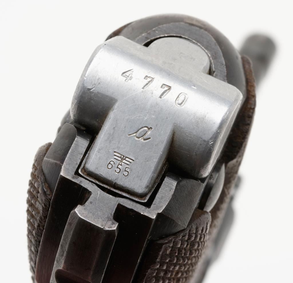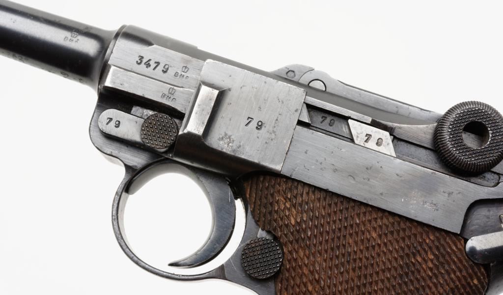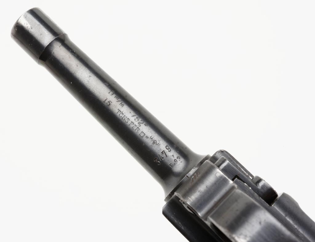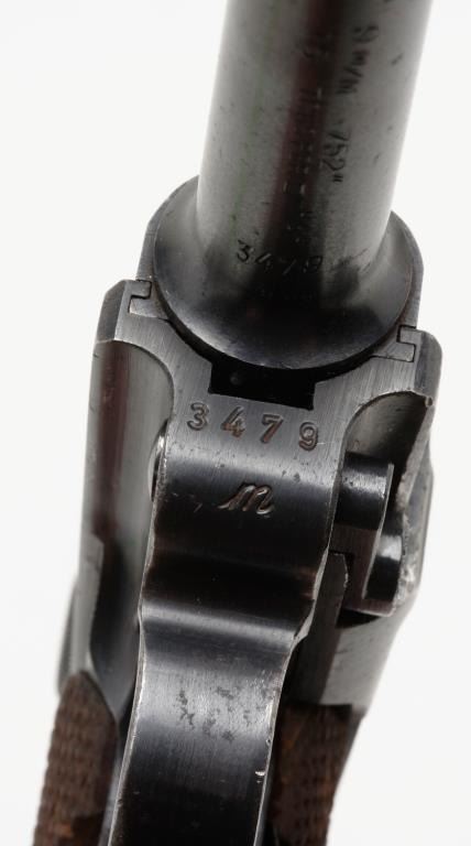 **German Luger semi-automatic pistol, 9mm caliber, 4” barrel, 1938 and S/42 marked breech, eagle 55 proof, S/N 3479 m, matching visible numbers except magazine (4770 a); British proofed, majority of blue finish remaining, very good bore, crispaction and sharp markings; good grips showing scattered wear and compressions to checking. Est.: $800-$1,600.