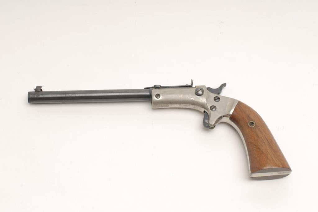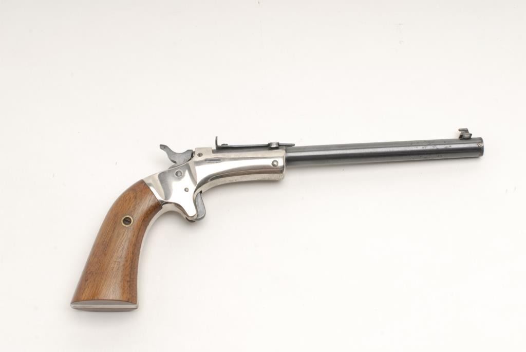 Lot 1821 Stevens Tip-Up single shot pistol, .22 cal., serial #57971. The pistol is in overall very good co