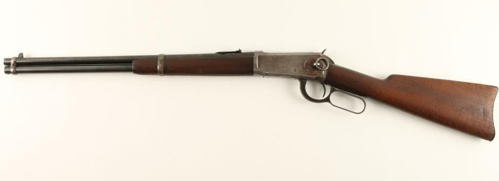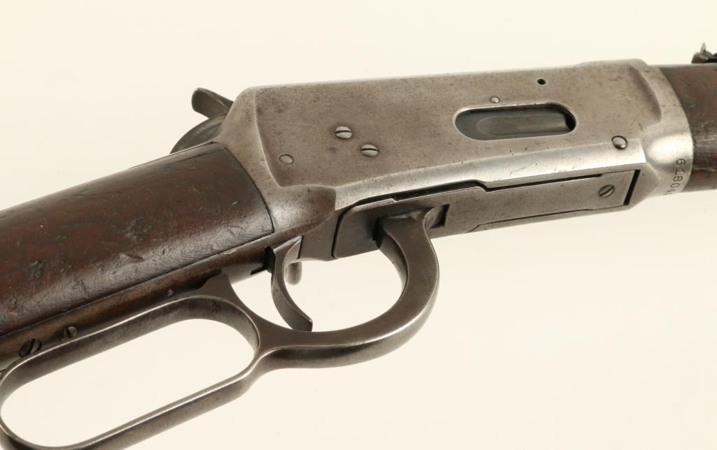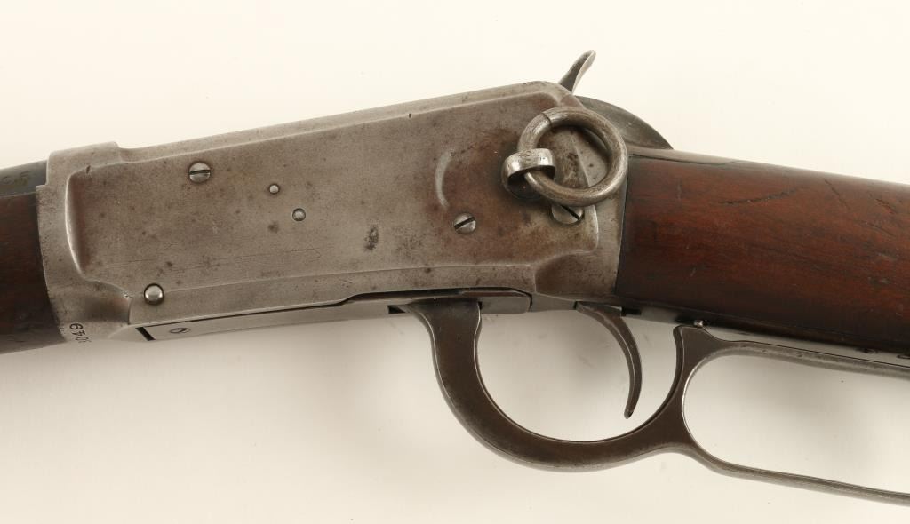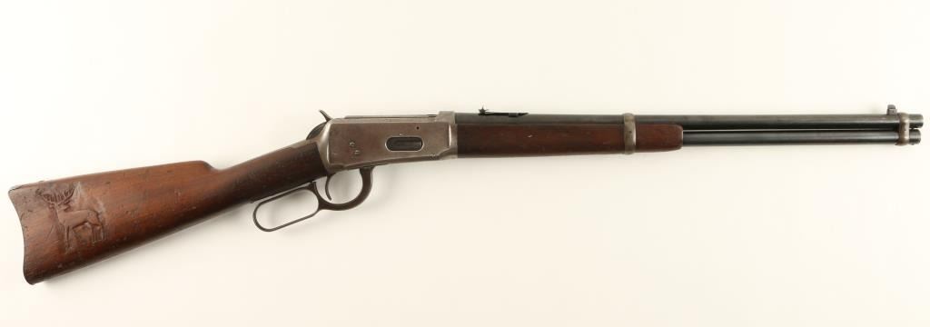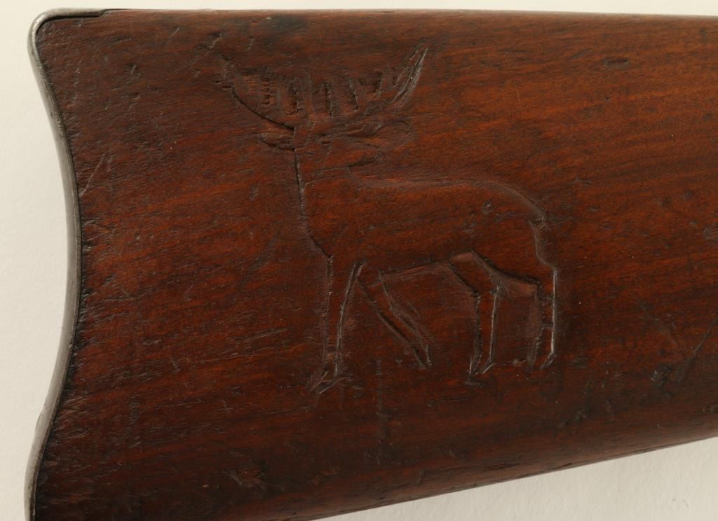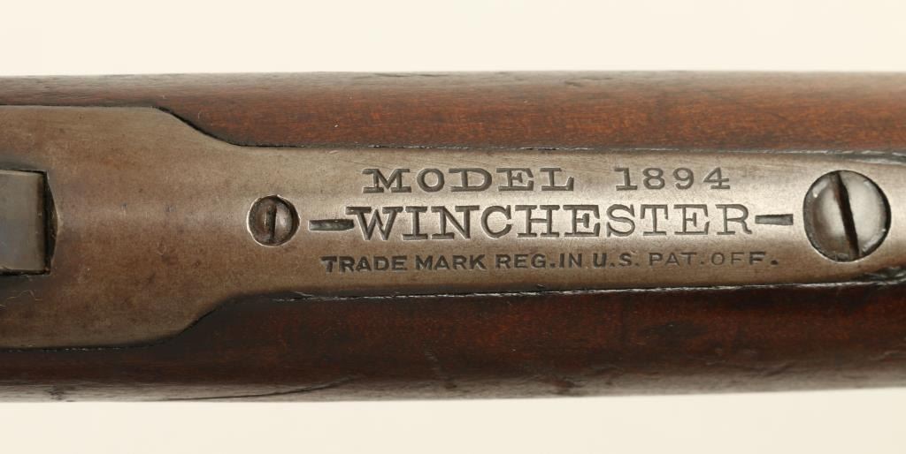 Winchester Model 1894 saddle ring carbine, .30 WCF cal., serial #618049. The carbine is in overall good condition with a 20” blued, round barrel featuring a blade front and folding leaf rear sight. The barrel and magazine tube retain asignificant amount of original blue while the receiver has gone primarily to a silver-grey patina with light surface rust and erosion noted. The carbine retains its saddle ring. The smooth gum wood stocks are in good condition withsignificant bruising and compressions and an old hand carved representation of a 10 point buck on the right side of the butt stock. The butt stock ends with a crescent metal butt plate which is slightly proud at the toe. The bore is very good, the action crisp and markings legible on this fine, old 94. (C+R) Est.: $600-$1,200.