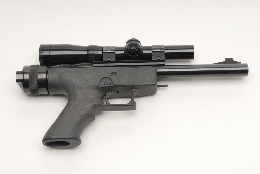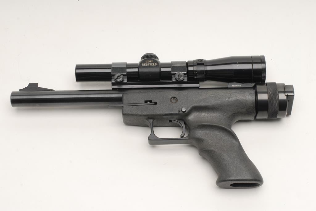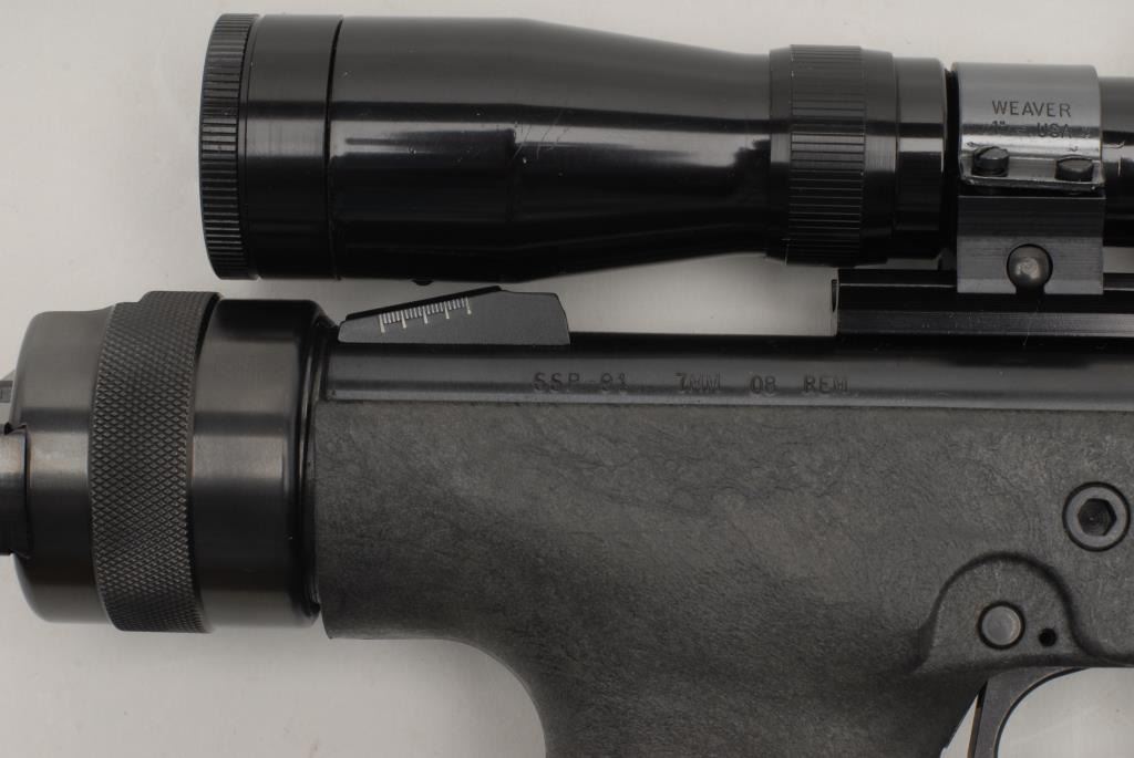 Ordinance Tech (made for Magnum Research) single shot pistol, 7mm 08 Rem. caliber, 14” bull barrel, S/N SSP-91, blued finish, composite stock, mounted with a Redfield 2X-6X scope with good optics. This pistol is in overall fine conditionwith a fine bore, crisp action, sharp markings and the majority of its original finish remaining; stock is fine also. (Modern/PPT). Est.: $300-$600.