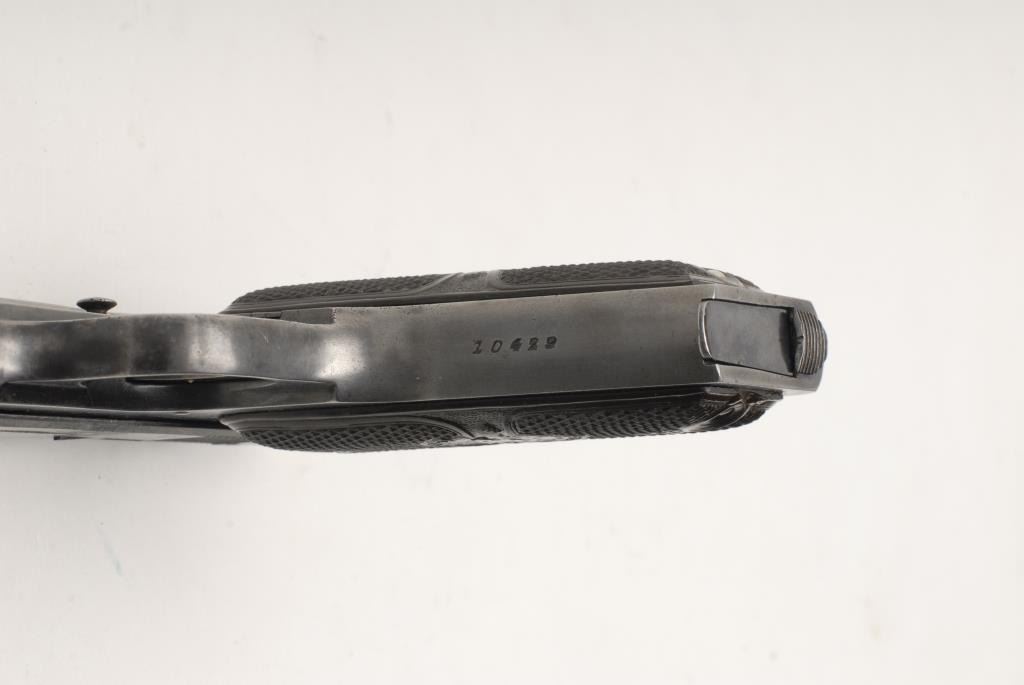 Reising “It’s a Bear” semi-automatic pistol, .22LR caliber, 6.75” barrel, S/N 10429, blued finish, checkered plastic grips with Bear and logo on both sides, in overall good to very good condition showing a grey patina to metal surfaces and somescattered pinprick pitting, fair to good bore, good markings and very good grips. (C&R/PPT). Est.: $250-$500.
