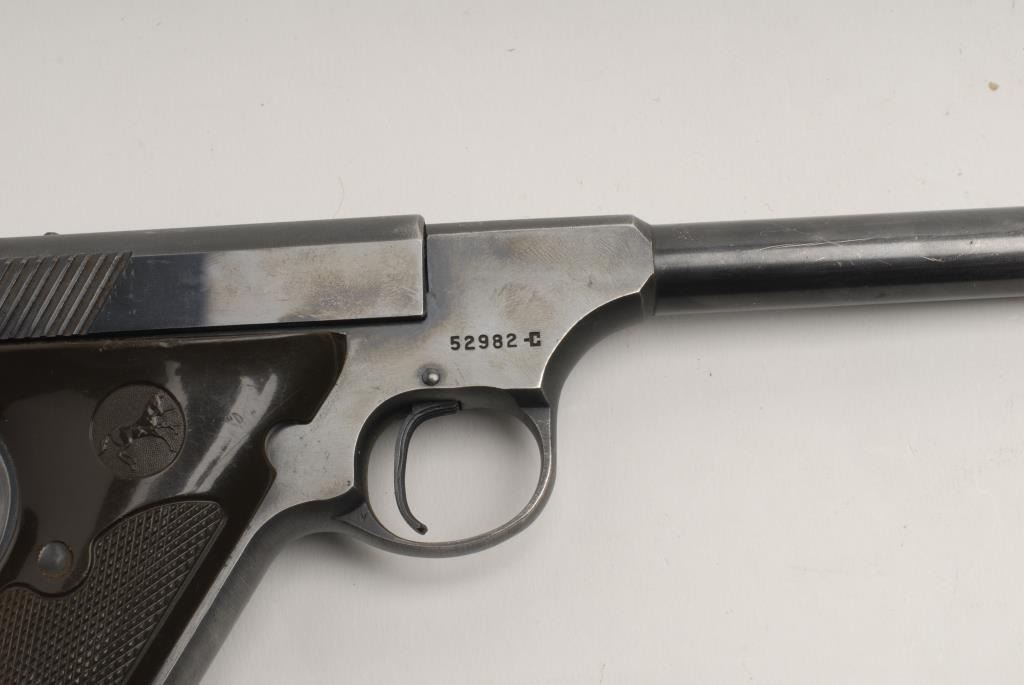 Colt Clallenger Model semi-automatic pistol, .22LR caliber, 6” barrel, 1 extra magazine, S/N 52982-C, blued finish, checkered plastic grips in overall very good to fine condition showing the majority of its original blue finish, fine bore,crisp action, sharp markings and very good to near fine grips. (Modern/PPT). Est.: $250-$400.