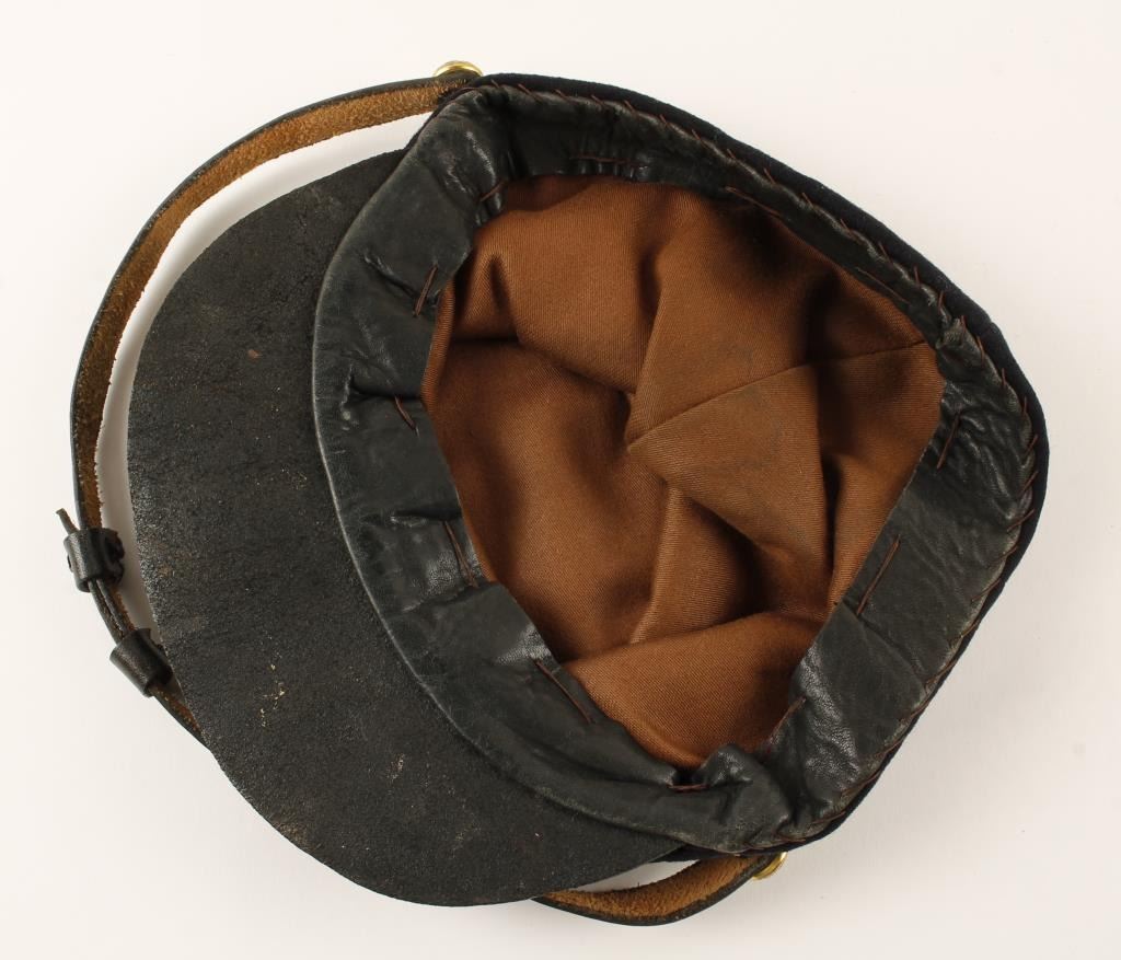 U.S. military kepi cap with leather brim, strap and brass horn emblem in overall very good condition; Civil War style but likely Indian Wars period. Est.: $200-$400.