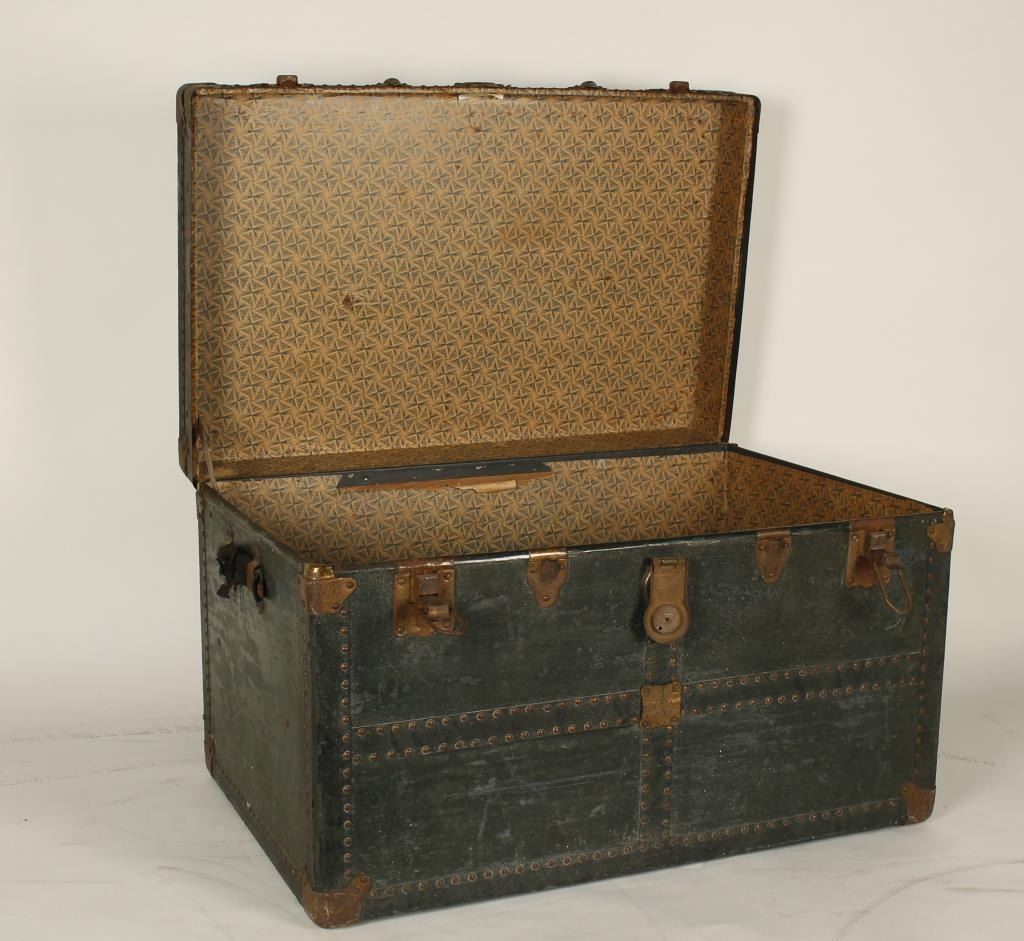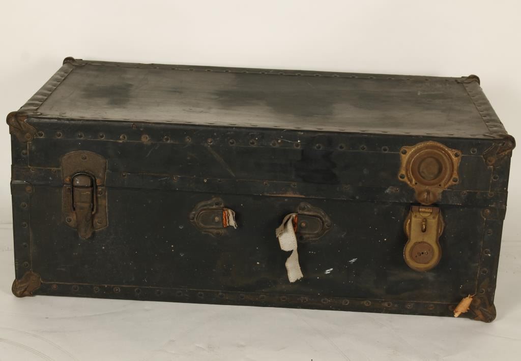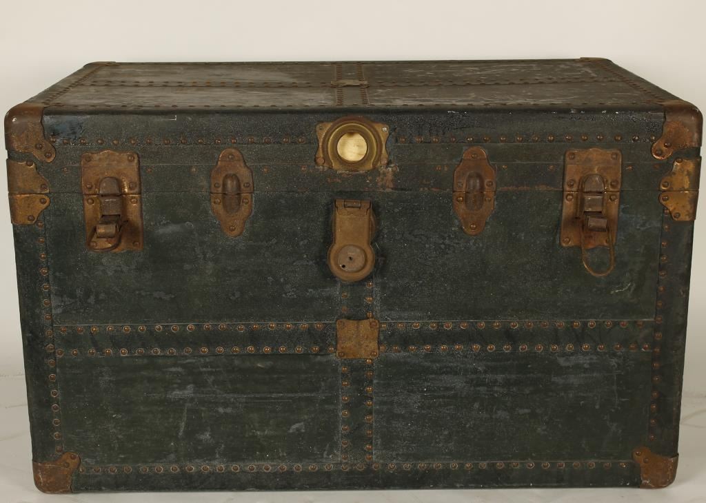 Bonanza lot of 3 old steamer trunks including a metal trunk, approximately 31” x 16” x 11”; a canvas covered wood trunk approximately 28” x 18” x 20” and an interesting steamer trunk with old stencil on end “Vivian Messetti/No. 6/Hotel”,approximately 33” x 21” x 20”; possibly an actress or performer of some type; would be interesting to research the name. Est.: $150-$300.