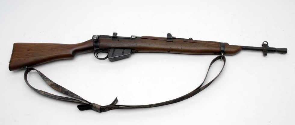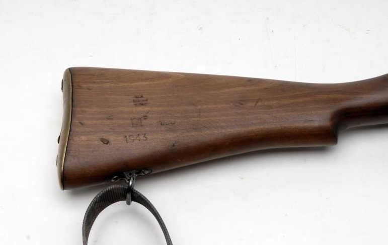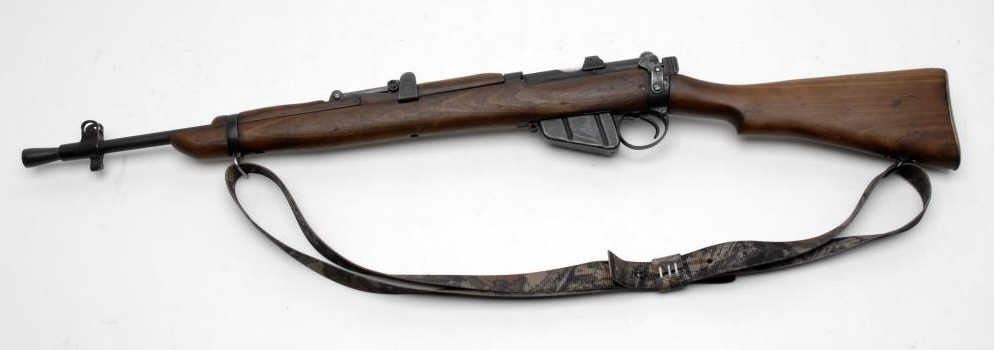 Enfield bolt action “Jungle” carbine, .303 British caliber, 23” barrel, S/N 34090, military finish, wood stock, modern camo woven sling in overall very good to very good condition marked “JUNGLE RIFLE” on left rear side of receiver, 1941 datedreceiver and 1943 dated wood stock; good bore, crisp action, good wood stock. (C&R/PPT). Est.: $250-$500.