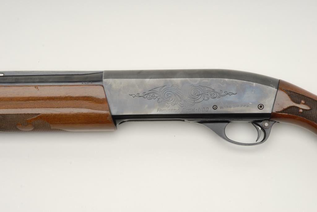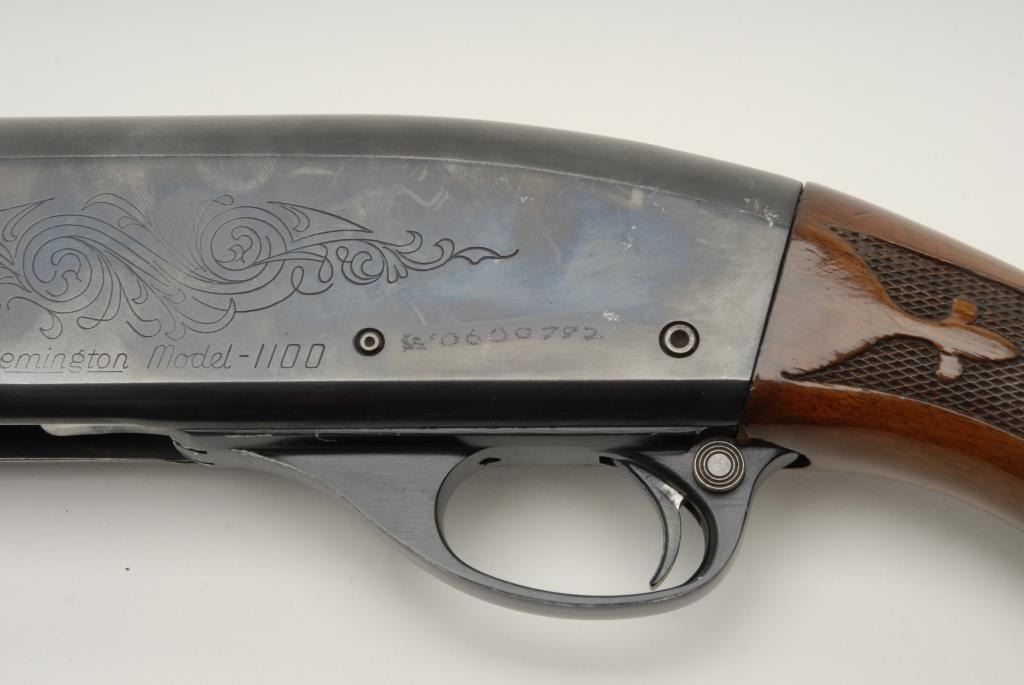 Remington Model 1100 semi-Auto shotgun in 12GA with a 26” barrel with poly choke and engraved, S/N W0600792. In good used condition with normal wear and imperfections. Sound mechanically. (Modern) Est.: $200-$400
