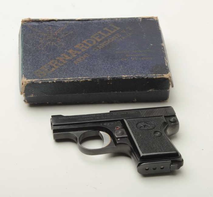 Italian Bernadelli pocket semi-automatic pistol, .22 long caliber, 2” barrel, S/N 16092, blued finish, checkered black plastic grips with 1 extra magazine and in factory cardboard box. This little pistol is in overall very good to finecondition with a crisp action, near fine bore, sharp markings and fine grips. (C&R/PPT). Est.: $150-$300.