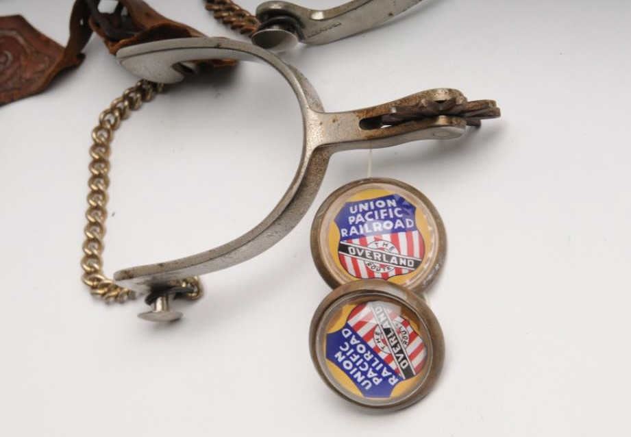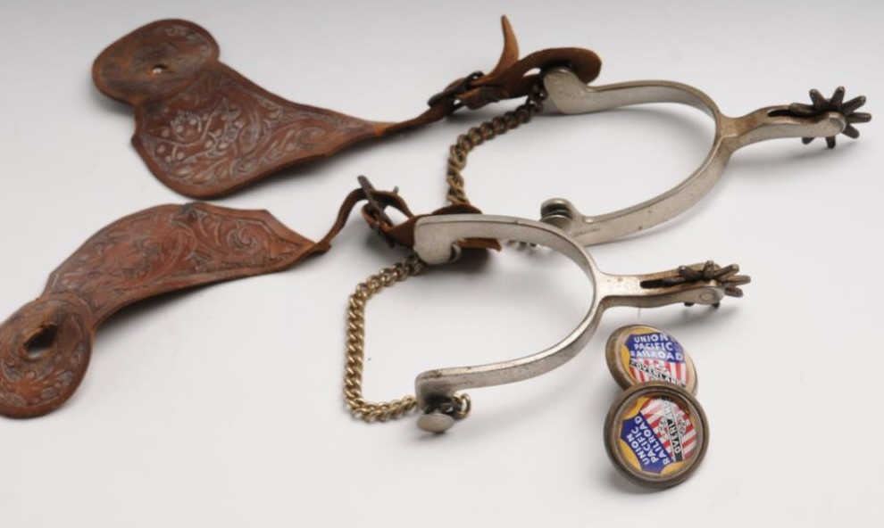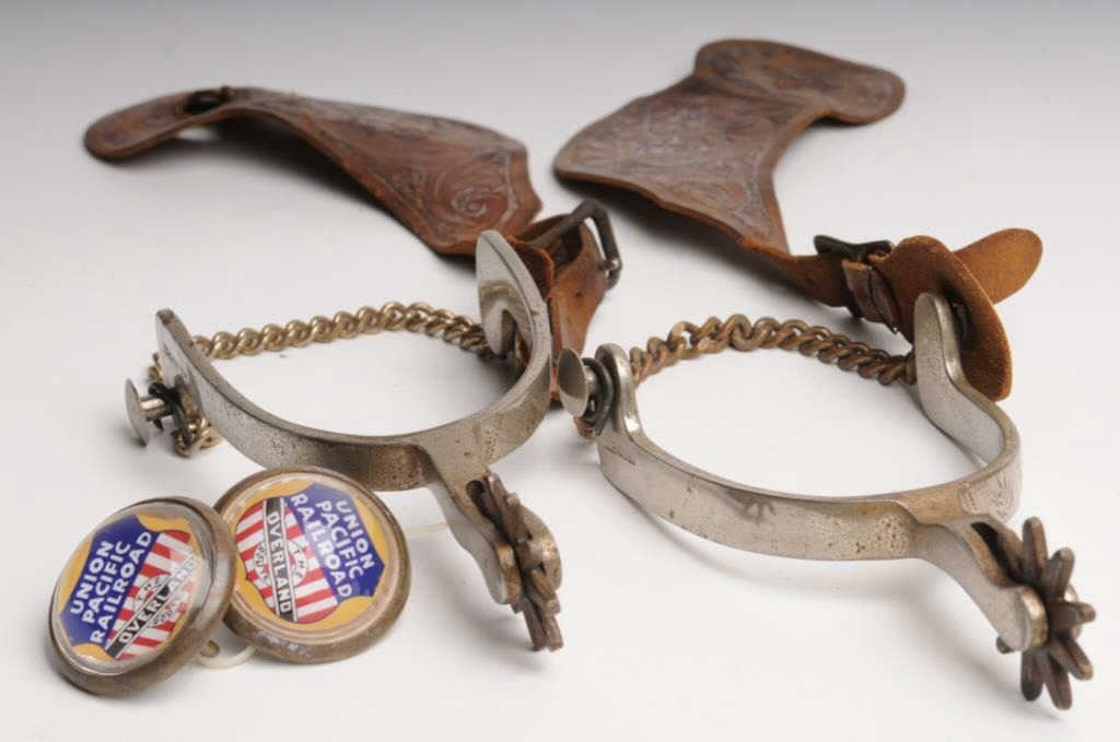 Pair of plain nickel finished spurs marked “CROCKETT” with basket weave leather straps and a pair of Union Pacific Railroad bridle rosettes. Est.: $150-$300.