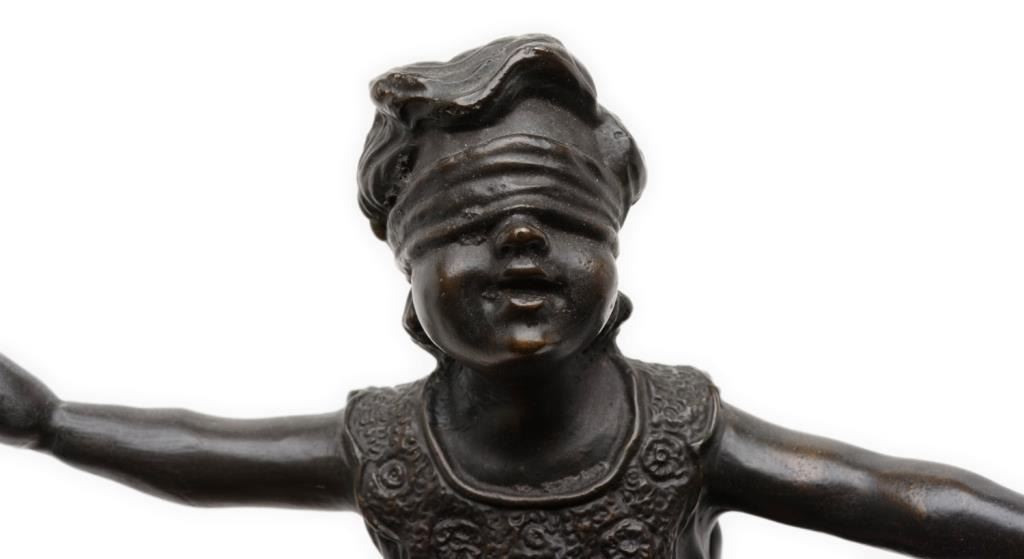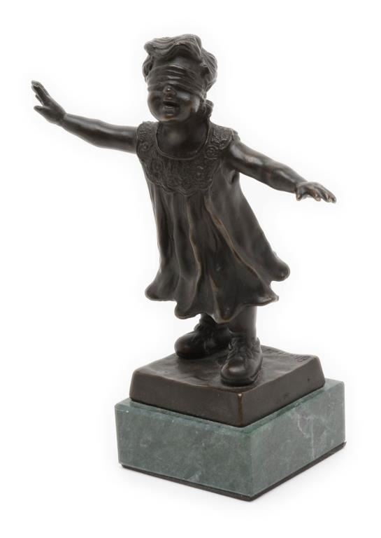 Small bronze on stone base of blindfold girl, approximately 8.5” in height including base with pleasing patina; no signature. Est.: $100-$150.