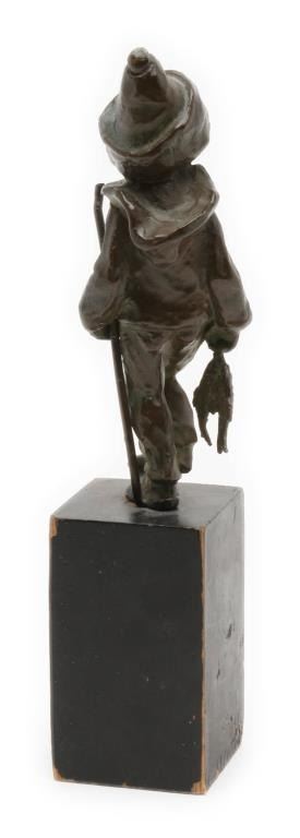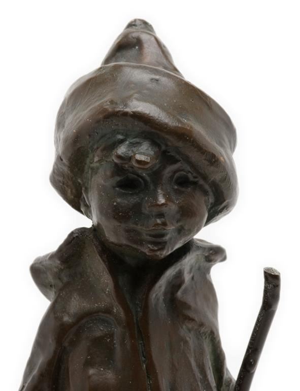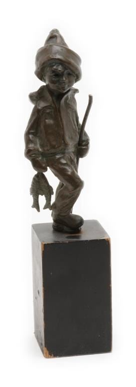 Bronze of small boy coming home from fishing; approximately 8” in height on a 5” wood base; nice dark patina; no visible signature. Est.: $100-$150.