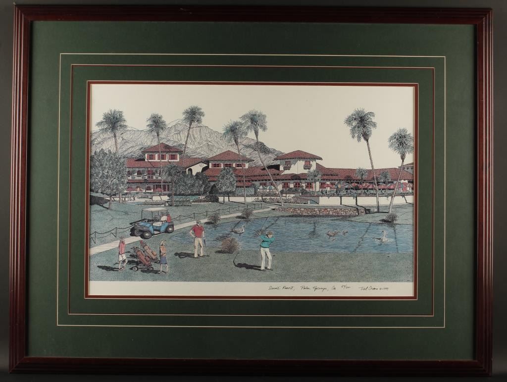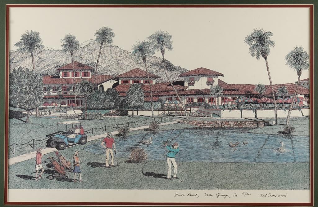 Large framed and matted color print (88/600) by Ted Crane (1989), approx. 33” x 42-1/2” of the Desert Resort, Palm Springs, CA. Est.: $75-$150.
