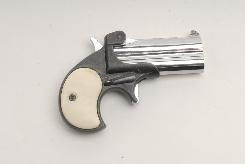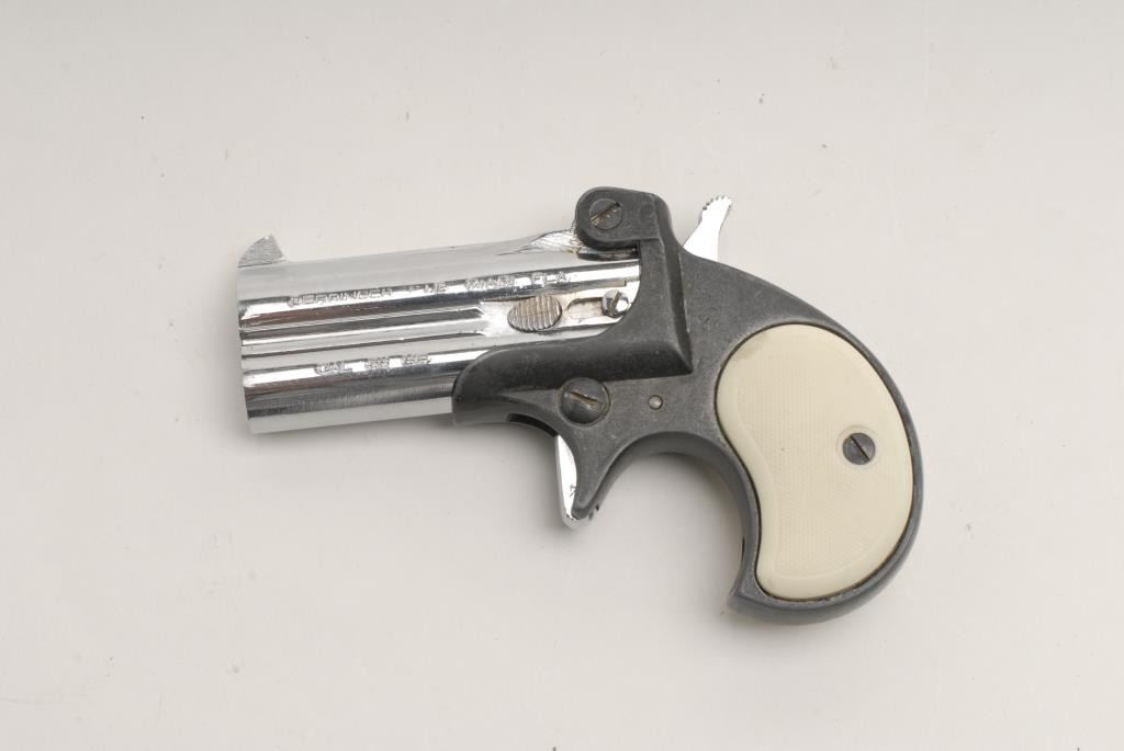 FIE Derringer pistol, .38 cal., serial #023732. The pistol is overall good condition with 3” nickel finished barrels. The barrels show little wear. The ivory colored checkered plastic grips are in very good overall condition showing onlyminor handling marks. The bores are very good, the action functions and the markings are legible. Est.: $60-$120. (Modern).