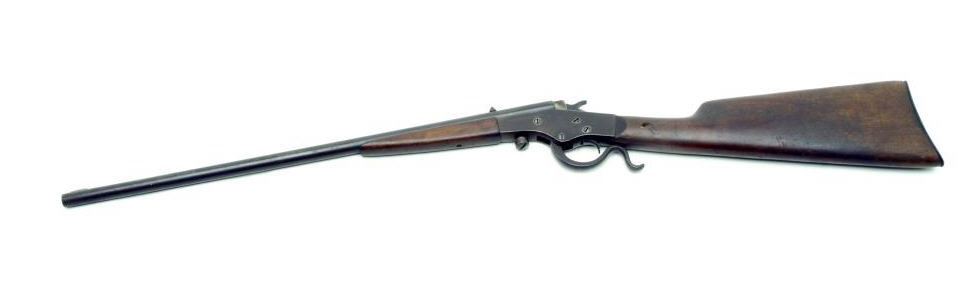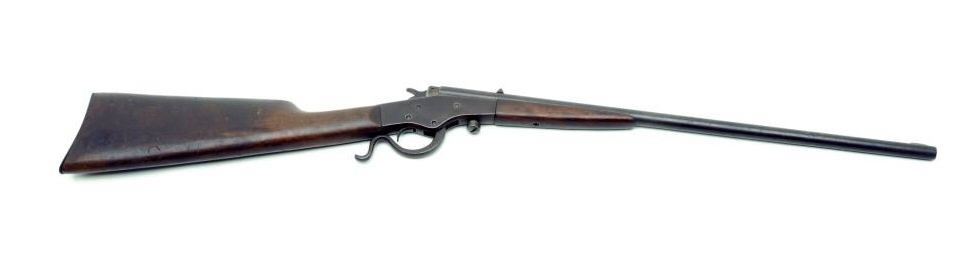 Stevens Crack Shot Model single shot rifle, .22LR caliber, 20” round barrel, no visible S/N, in overall good condition with a good bore, action and markings; wood stocks are also overall fair with old initials carved into the right side ofthe butt stock, a gouge at the wrist of the left side of the butt stock plus a crack at the top of the wrist area. (C&R). Est.: $75-$150.