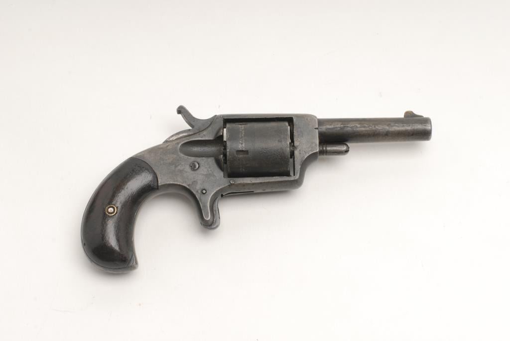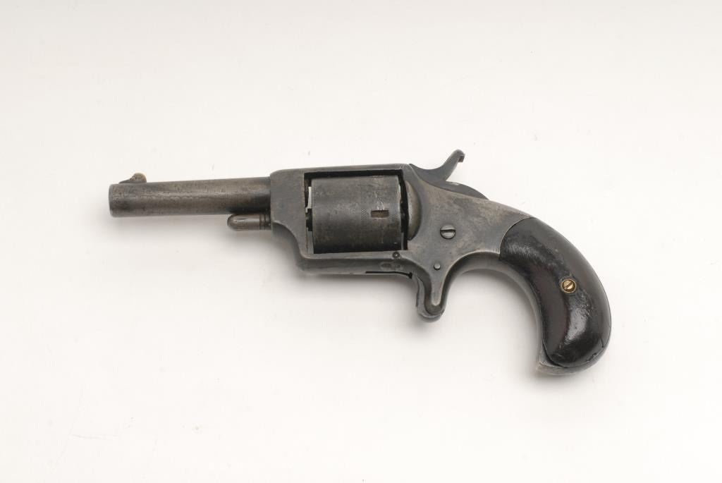 Dictator spur trigger revolver, .32 caliber, 2.75” barrel, no visible serial #, wood grips; parts gun only; crack on left side of bottom frame strap. (Antique). Est.: $80-$160.