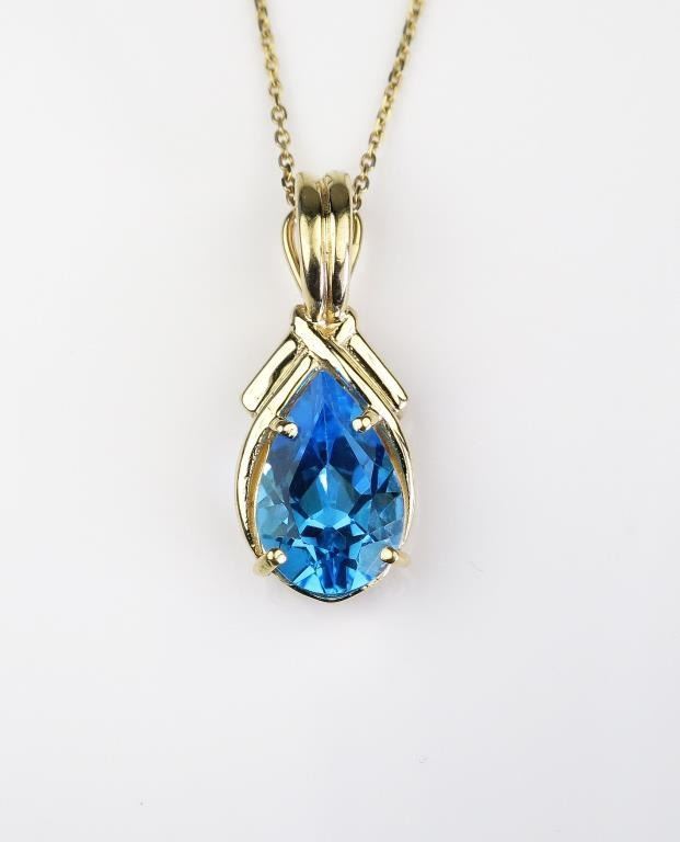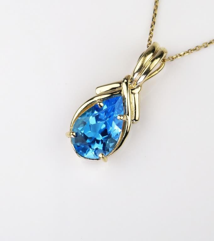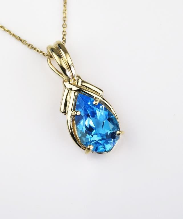 Fabulous Swiss blue topaz pendant featuring an approx. 5.00 carat pear shape topaz set in a 14 karat yellow gold setting an Italian chain. Retail $1,000-$1,500 Estimate $600-$900