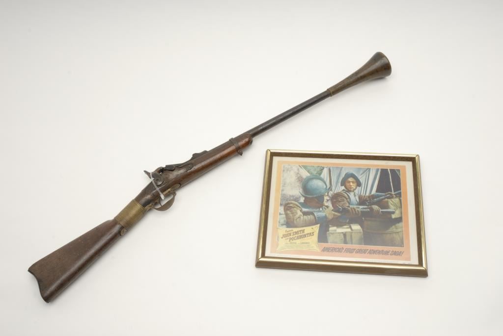 Movie prop blunderbuss from the Stembridge Gun Arsenal used in Hollywood’s golden age. Still shots from Captain John Smith and Pocahontas show just this style prop. Also similar props used in The Big Trail with John Wayne, Marx Bros andnumerus classics. Altered for blanks and somewhat rough condition. Est.: $600-$1200