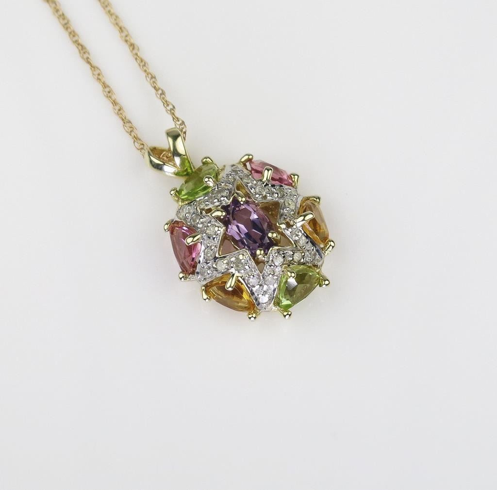 Colorful ladies designer pendant set with Amethyst, Peridot, Citrine Pink tourmaline and 22 diamond accents set in 10 karat yellow gold setting. Estimates $600-$900
