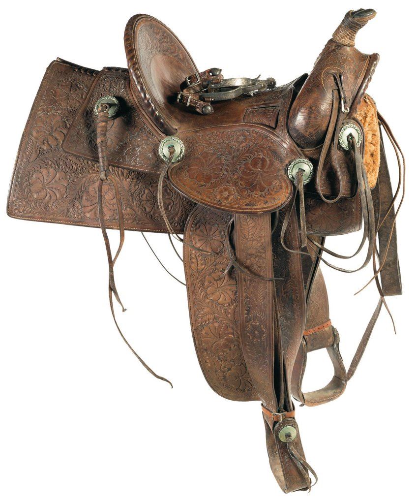 Lot 79 D. E. Walker Tooled Leather Western Saddle and Engraved Spurs