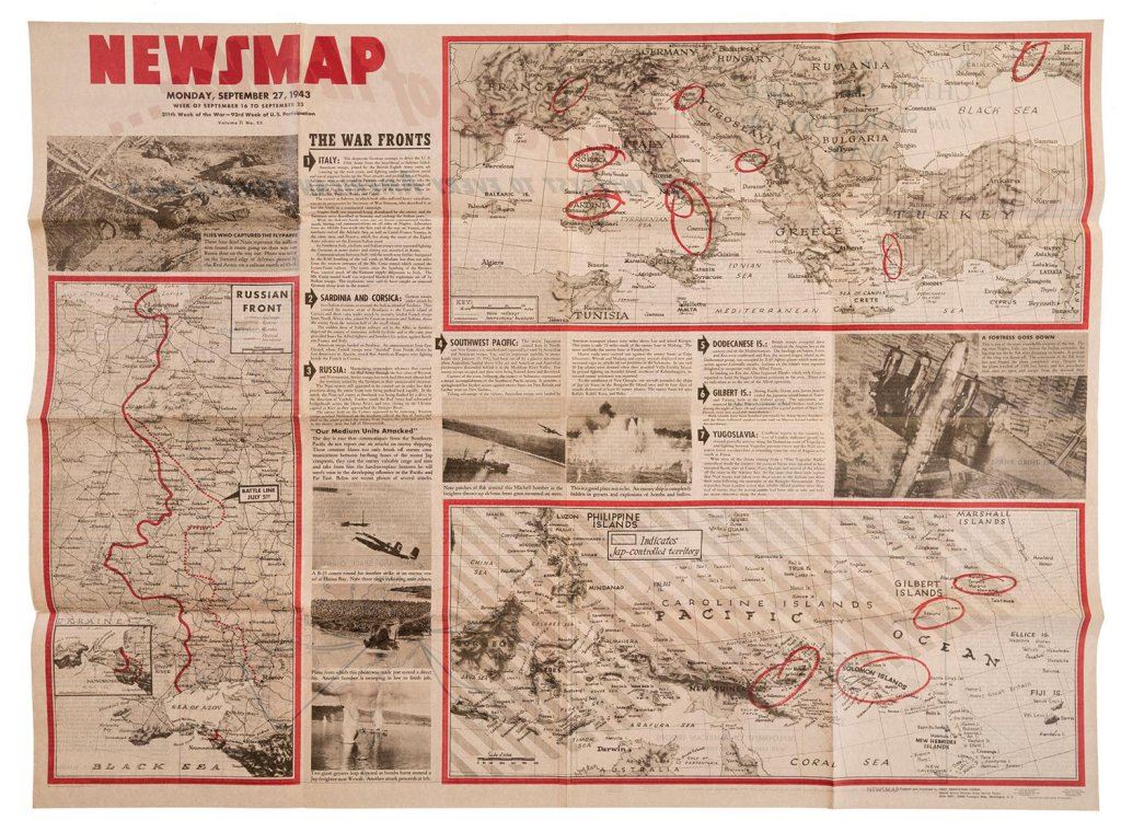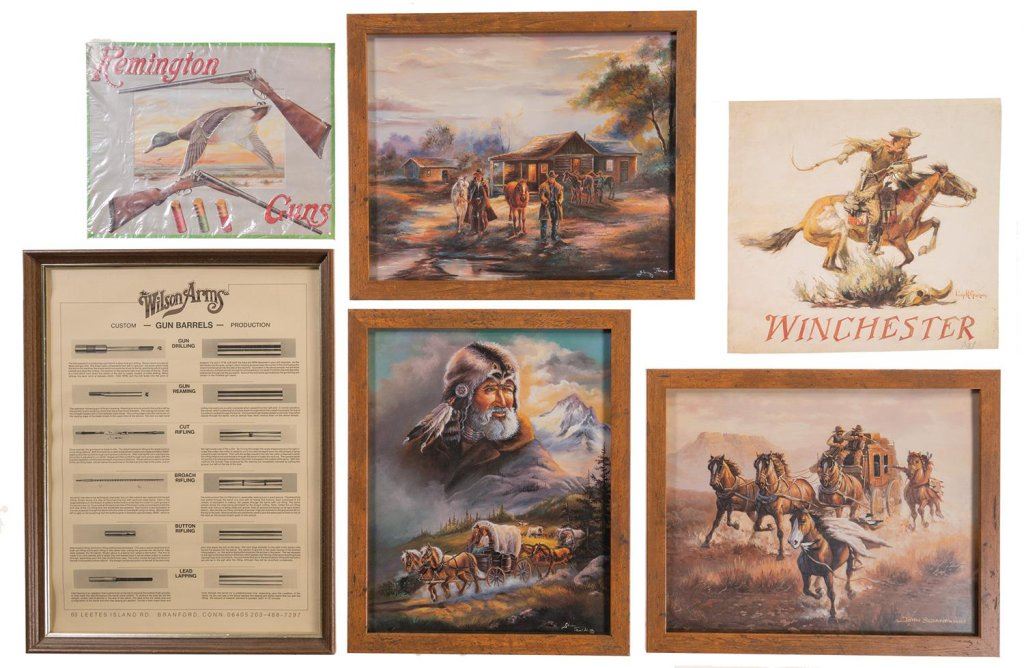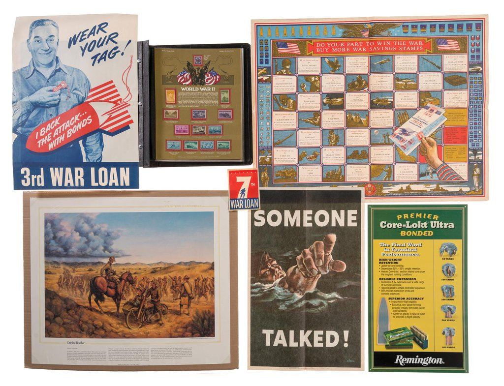 The lot includes: 1) Postal Commemorative Society World of Stamps collection. 2) Two Remington and one Winchester advertising prints. 3) Three Western themed paintings with frame. 4) One framed Wilson Arms advertising print. 5) "On the Border" print. 6) Collection of WWII era war bond advertisements. Fine to excellent.