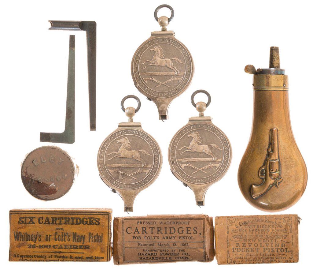 The lot consists of: 3 reproduction Colt Patterson style cappers with silvered bodies and nitre blue small parts. Very good overall. 1 small brass powder flask with an embossed revolver on the front. Fine. 1 small tin of percussion caps marked "ELEY/LONDON" on the lid. Fair. 2 combination tools, one with nipple wrench. Very good. 3 sealed reproduction skin packs of combustible cartridges for Colt revolvers. Very good.