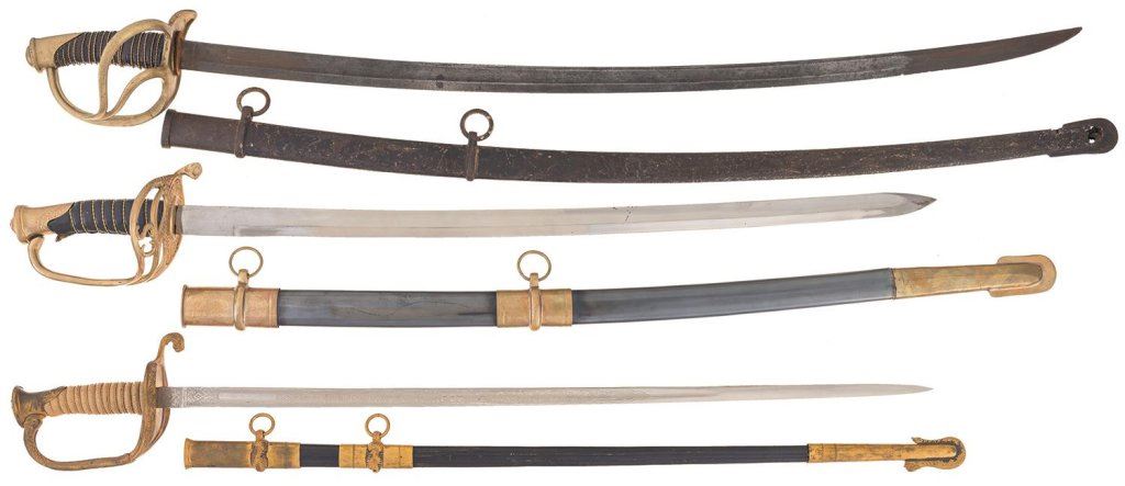 1) "1862" dated non-regulation cavalry sword with 40" OAL, 34 1/4" blade, and poor scabbard. 2) "CS" reproduction sword with 34 1/2" OAL and 28 1/2" blade. 3) Browning King & Company (NYC) Naval sword with 34 1/2" OAL, 29" blade, and some lost grip wire. Good overall except as noted.