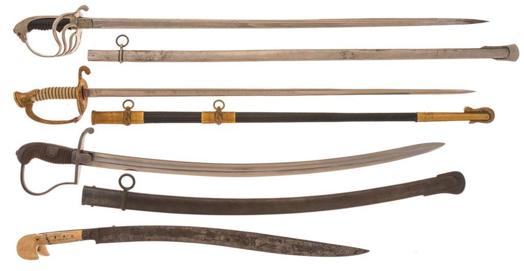 1)Toledo sword, 38" OAL, 33" etched quillback blade, celluloid grip, eagle head pommel and nickel scabbard. Good. 2) "U.S.N." officer sword, 37" OAL, 31 1/2" etched blade, gilt brass hilt, plastic grip, leather scabbard. Scabbard tip detached and repaired backwards, otherwise good. 3) A. Coppel cavalry sword, 35" OAL, 29 3/4" blade marked "crown/W/13", iron guard and scabbard, hard rubber grip. Good. 4) Yataghan short sword, 28" OAL, 22" blade, silver koftgari overlay and carved bone grips with a flared pommel. Grips cracked, otherwise fair.