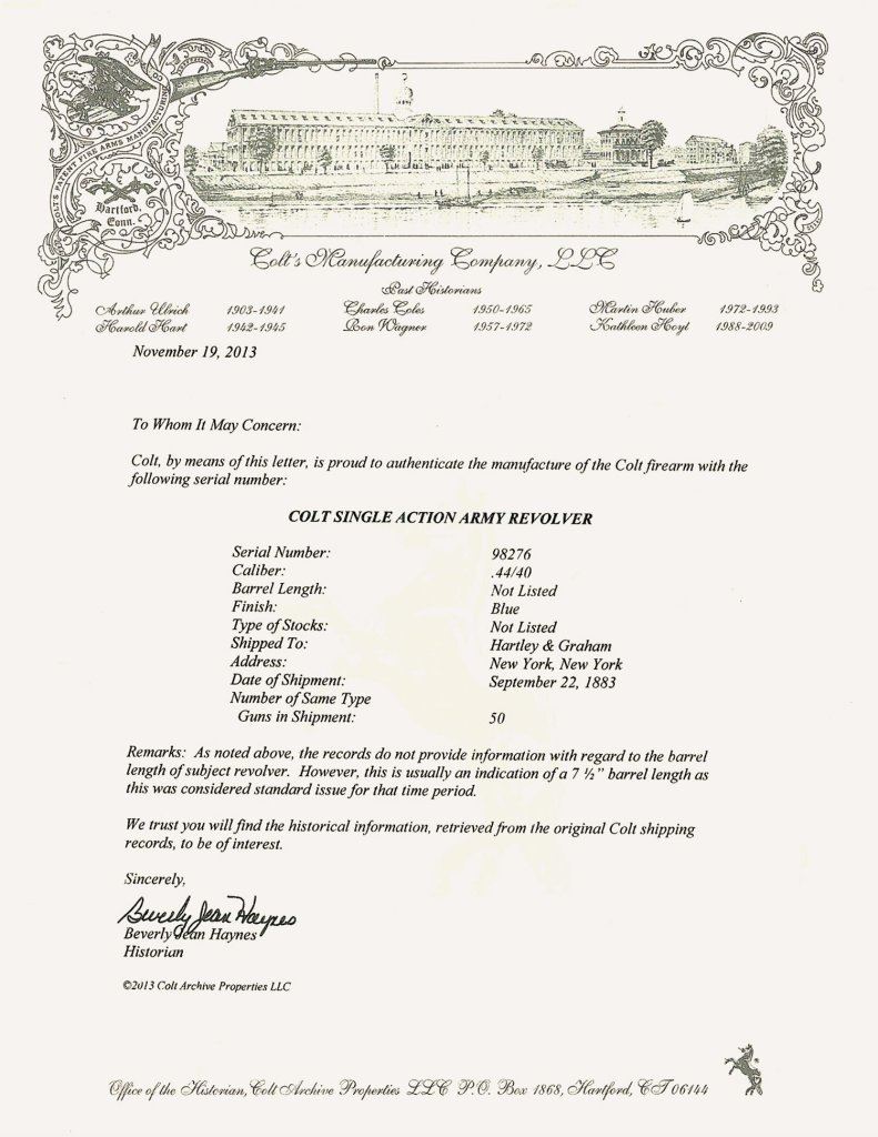 The letter confirms the revolver shipped in a lot of 50 in .44-40 with "blue" finish (blued/casehardened) to Hartley & Graham in New York City on September 22, 1883.