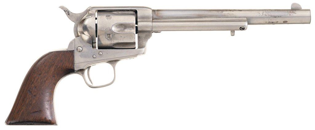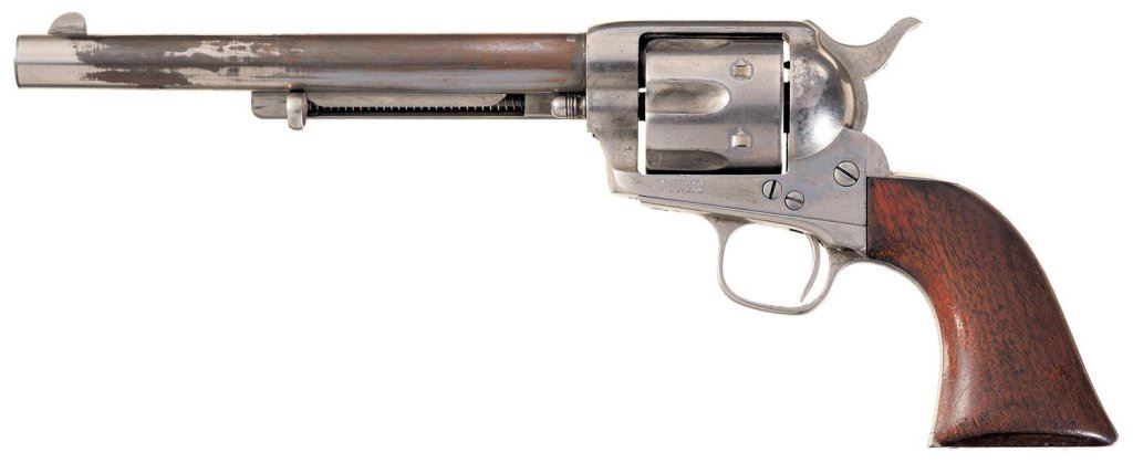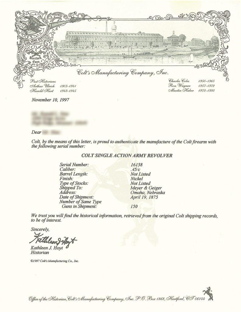 The revolver was part of a 150 gun shipment in the current configuration (barrel length and grips not listed) to Meyer & Geiger in Omaha, Nebraska, on April 19, 1875.